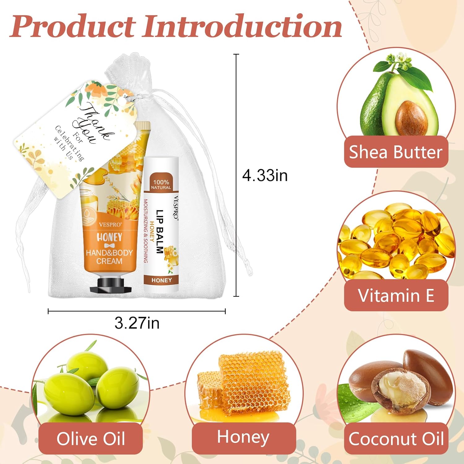 • 【Unique Party Favors for Guests】Our hand cream bulk and lip balm bulk set have 5 different fragrances - Lemons,grapes,peaches,aloe and honey.In addition,5 different colors are perfect for weddings and party,these thank you gifts can be distributed as gratitude gifts to guests and coworkers.