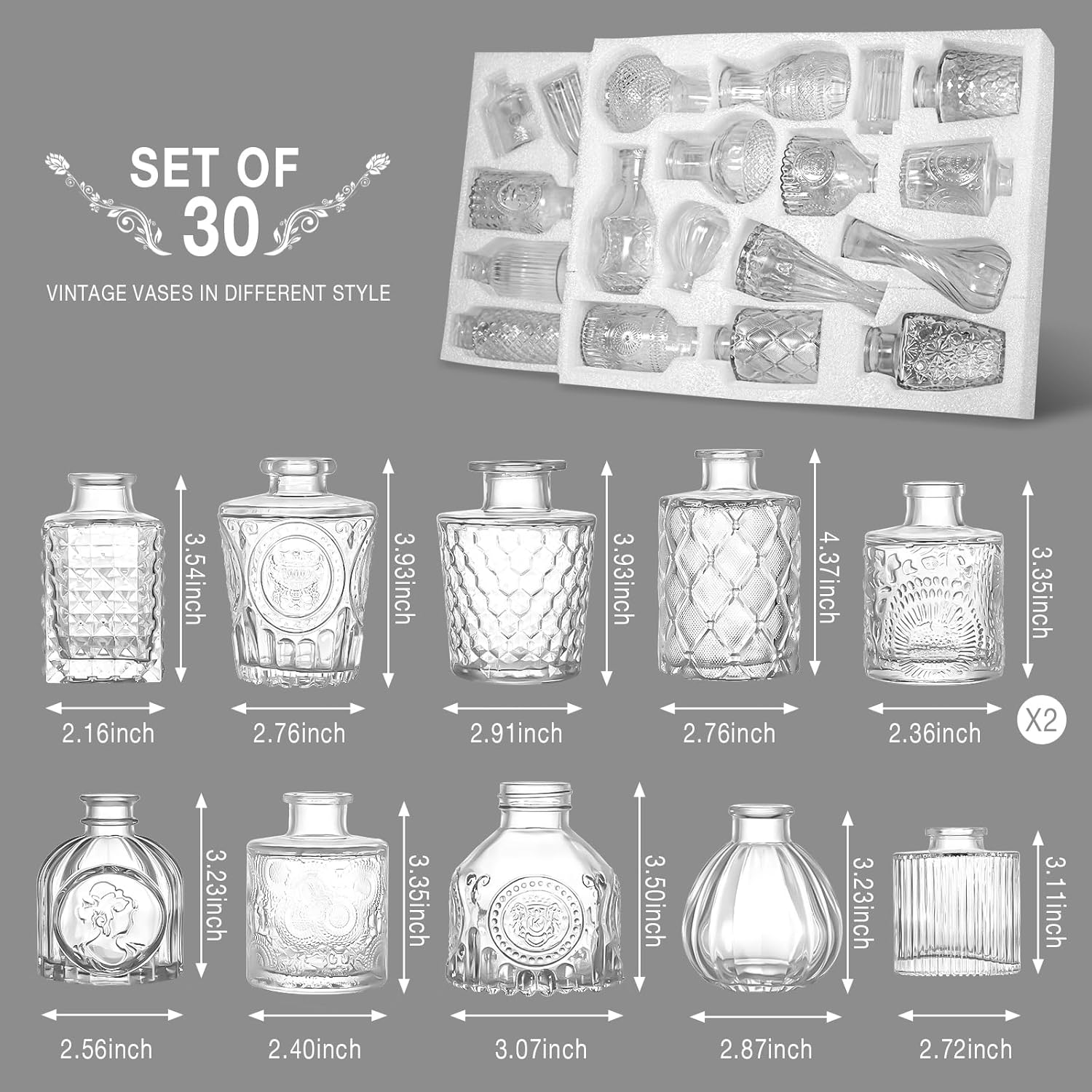 • 🍀Wide Application: Each of our clear glass bud vases have vintage embossed patterns on them, classic and elegant, can be used not only as vases, but also as aromatherapy oil bottles, candle boxes, hydroponic vases, propagation jars, Christmas vases, table decorations, wedding decorations.