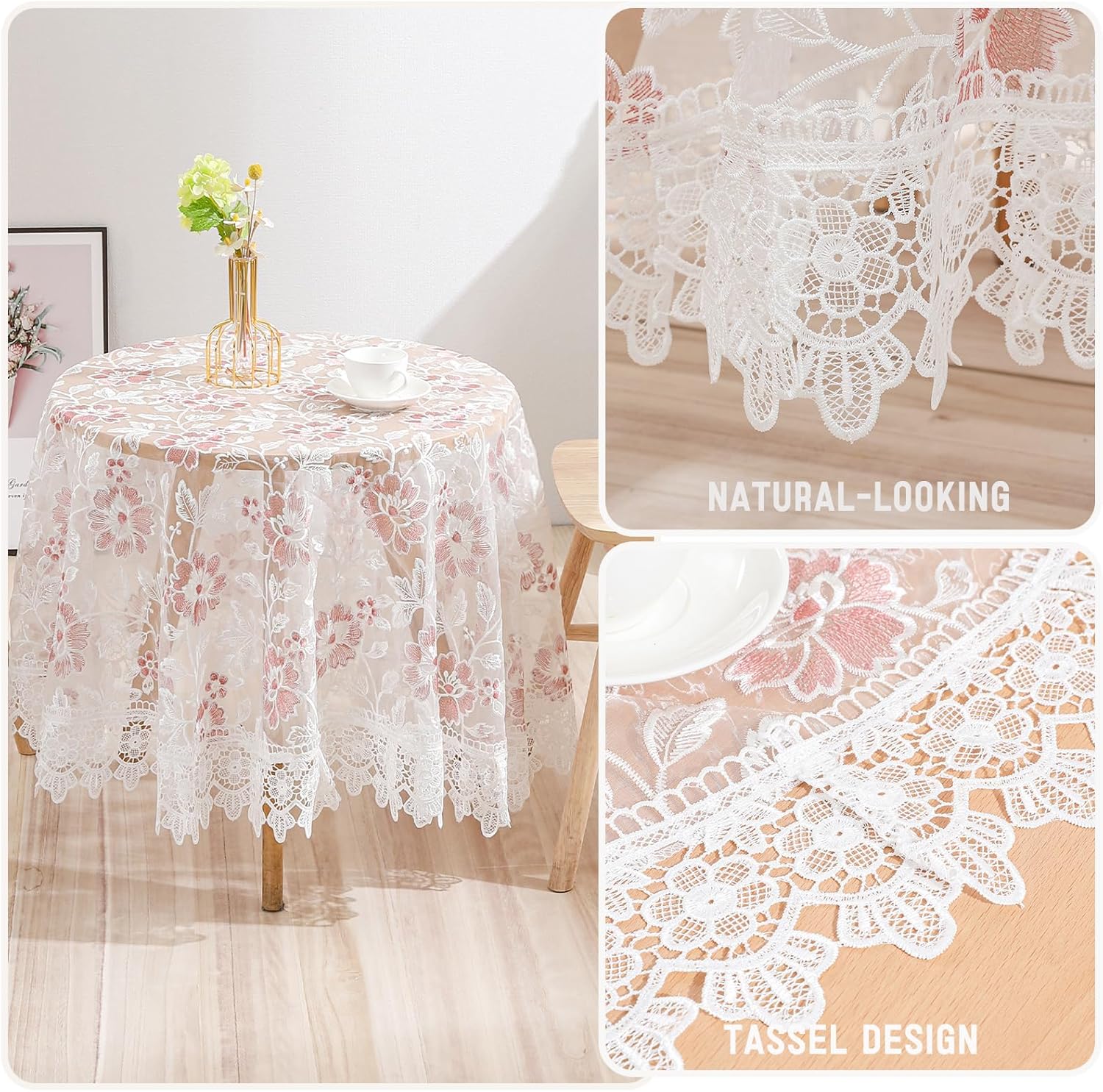 • Material: Round tablecloth, lace tablecloth, polyester, soft and delicate, three-dimensional embroidery with intricate lace flower design around the edge.