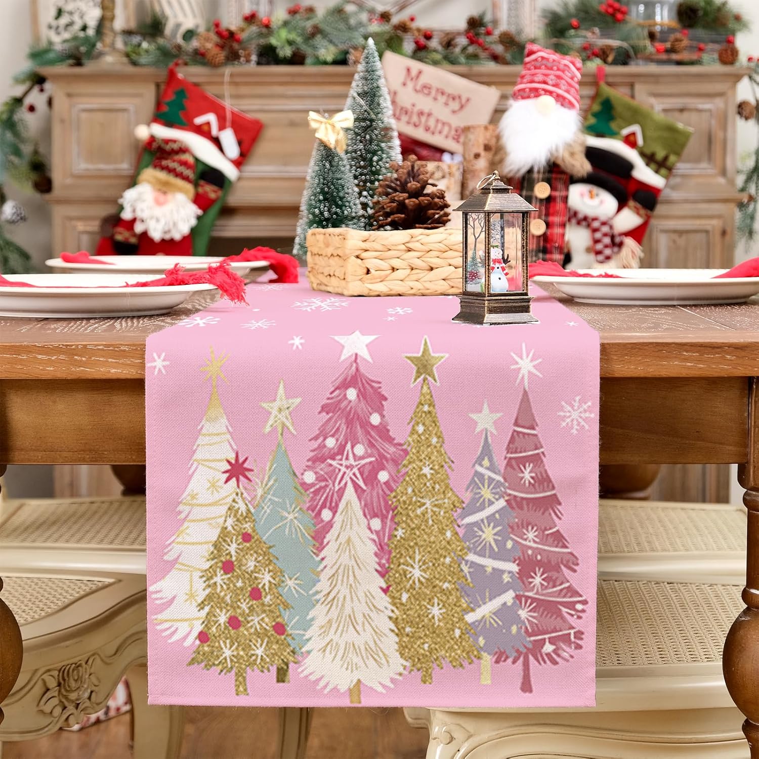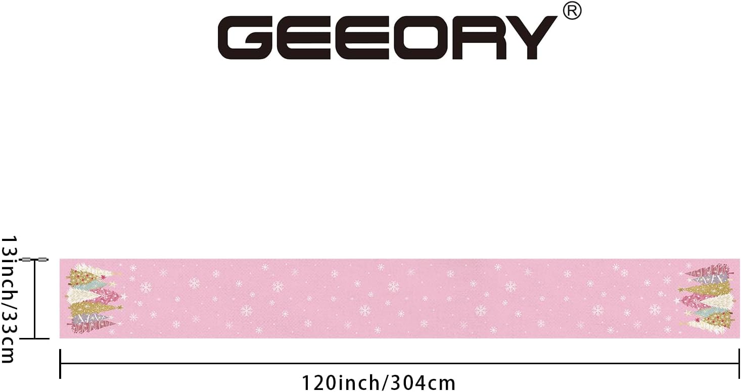 GEEORY Christmas Table Runner 13x120 Inch, Xmas Trees Snowflakes Holiday Decorative Farmhouse Table Decoration for Kitchen Dinning, Indoor Outdoor Dinner Party Decor (Pink) GT153-120