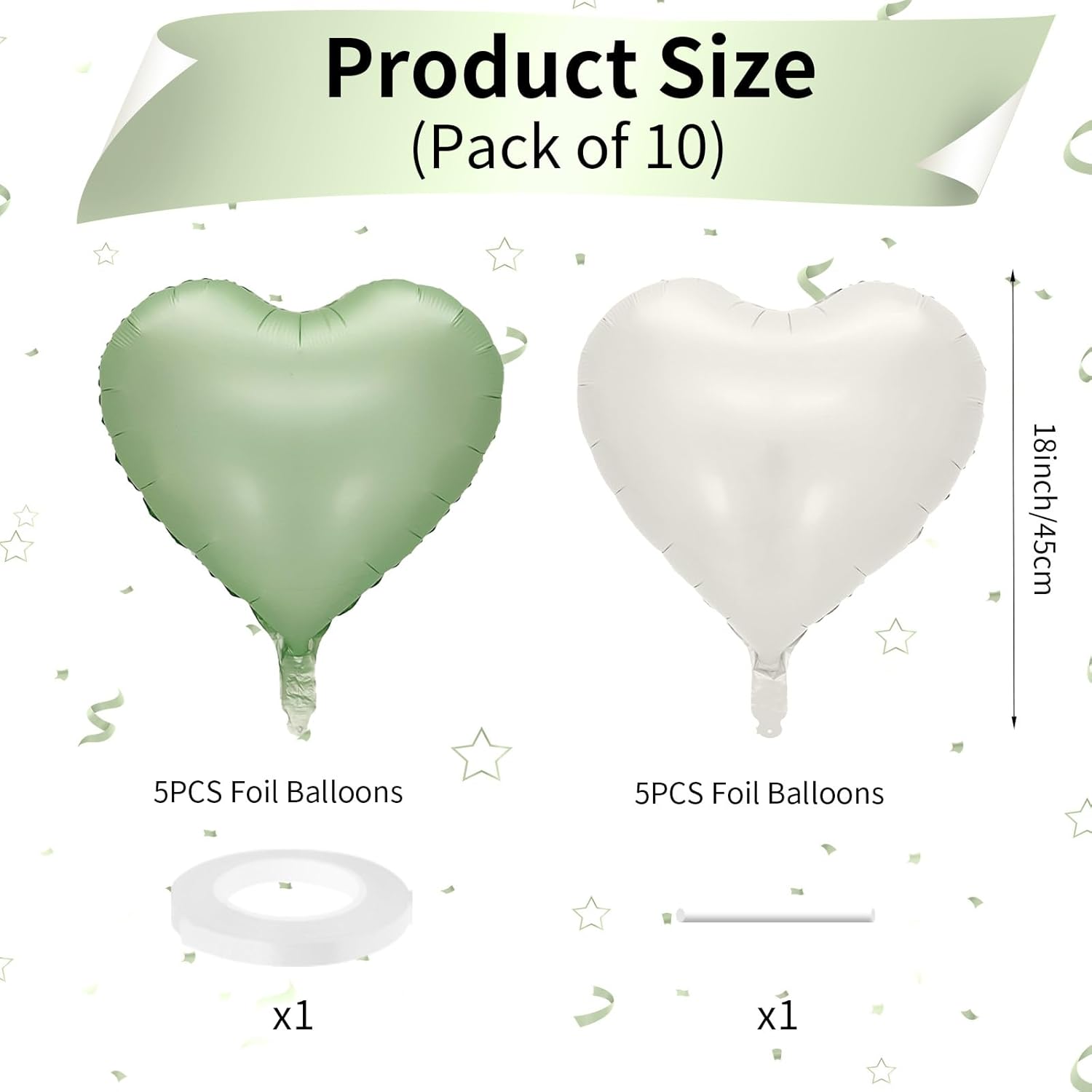 • 10 PCS Sage Green White Heart Balloons: Our package contains 5 x 18 inches green heart shaped balloons, 5 x 18 inches beige heart shaped balloons, 1 x 10m ribbon. The olive green cream white foil heart balloons are specially designed to add a touch of fun and surprise to any party or holiday celebration. With a size of 18 inches, they are the perfect addition to your decorating needs, leaving your guests with an unforgettable smile!