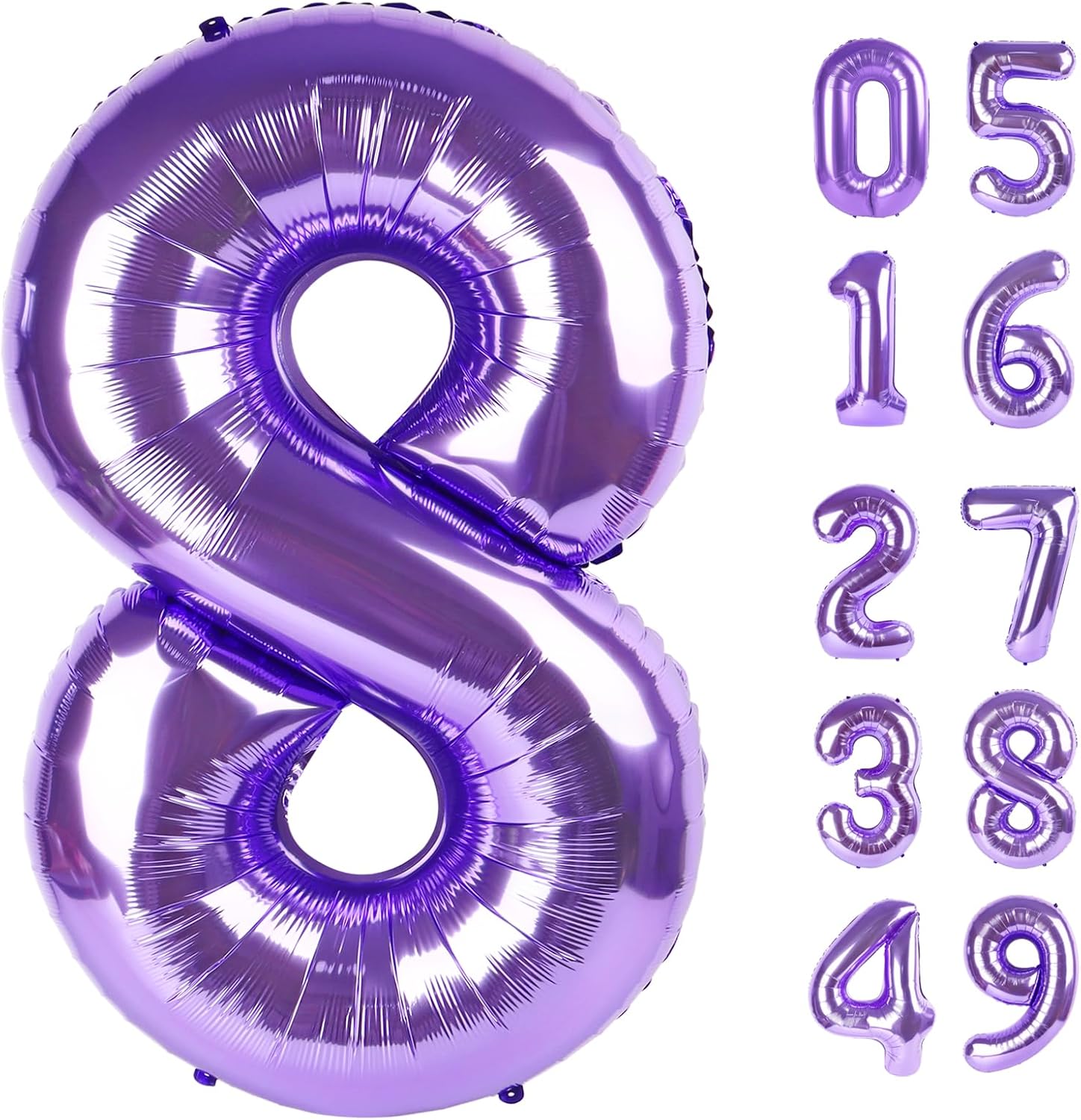 • 1.Noble Romantic Purple Number Balloons: You will receive an uninflated 40 inch purple number 8 balloon. Balloons are always the best statement of romance surprise. Purple aluminum foil number balloon set symbolize eternal magical, adding glamour to birthday parties. Elegant purple and huge size make 8 balloons for birthday girl a highlight of special parties. Choose one or more numbers from 0-9 number balloon, and use 8 18 28 38 48 58 68 78 80 98 balloon numbers to create a lively charming party!