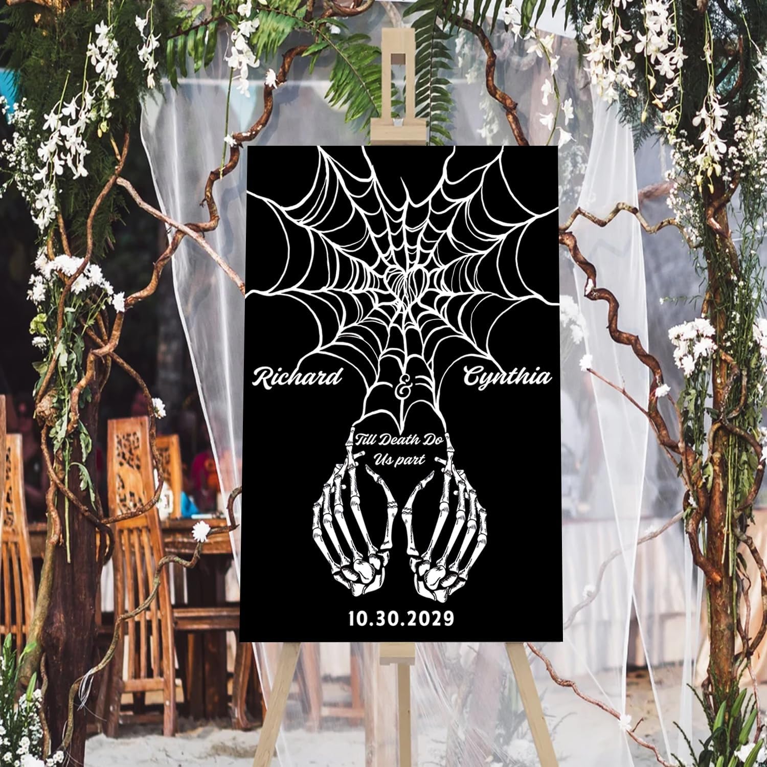 • A stunning choice for those planning a Gothic-inspired wedding or a Halloween-themed celebration. Whether you're exchanging vows on All Hallows' Eve or simply love the allure of Gothic aesthetics, this welcome sign will captivate your guests and make a bold statement.