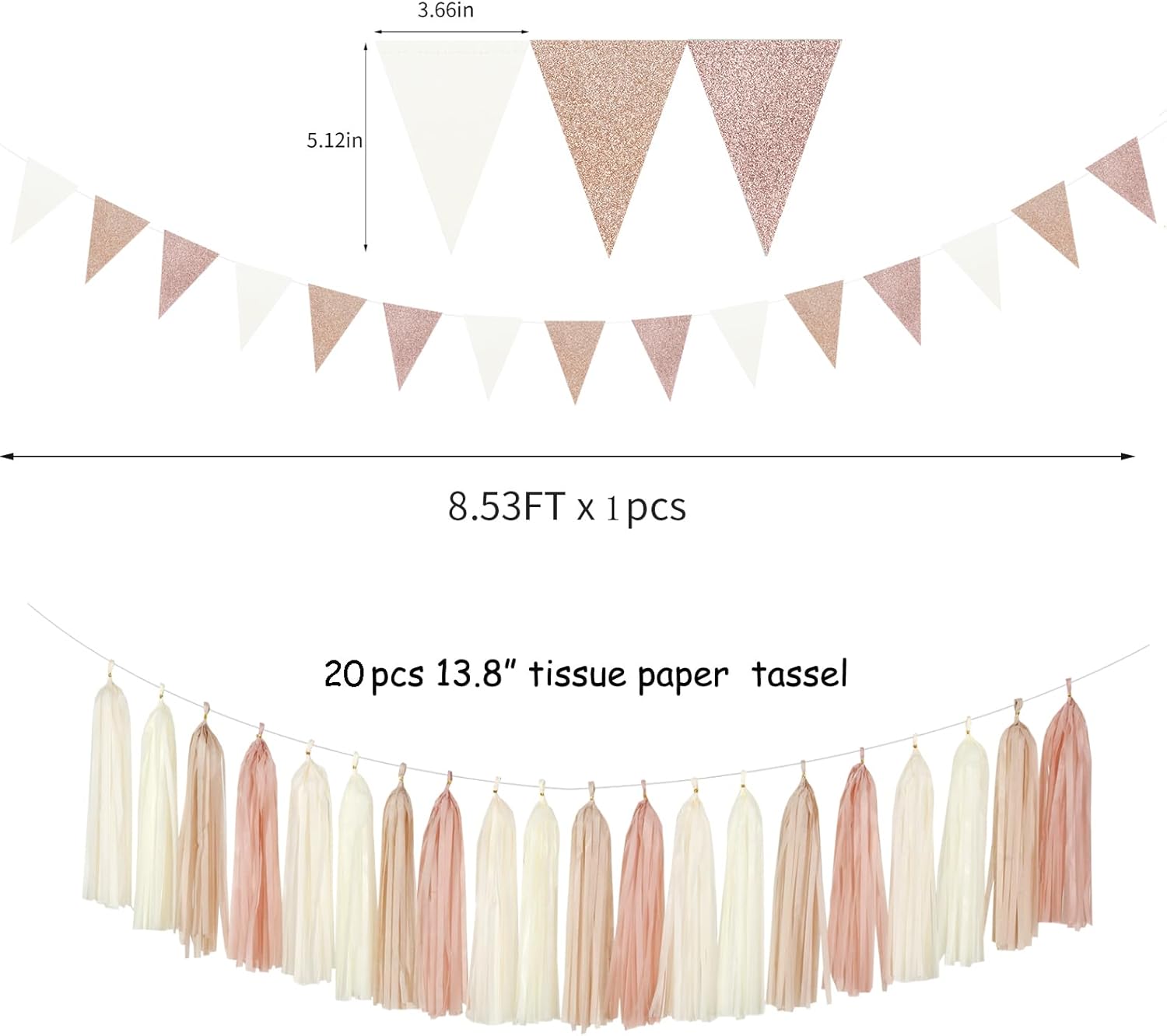 • 【Champagne Gold Beige Peach Party Kits】The bohemian party decorations kits include 6pcs tissue paper flowers: 3pcs 8" and 3pcs 10" in champagne gold beige color, 1pcs Triangle Flags,1pcs circle dots paper garland,20pcs tassel garland. Total23pcs.