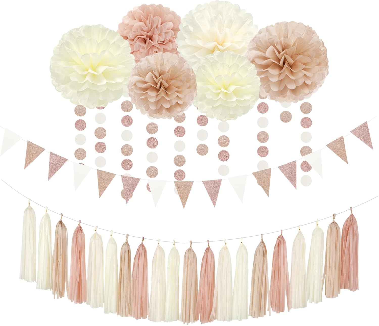 Champagne-Gold Beige Boho Baby-Shower Party-Decorations - 23pcs Fall Rustic Neutral Bridal Wedding Paper Tissue Pom Poms Streamers,Retro Tassel Garland,Girl Birthday Banner Decor Lasting Surprise