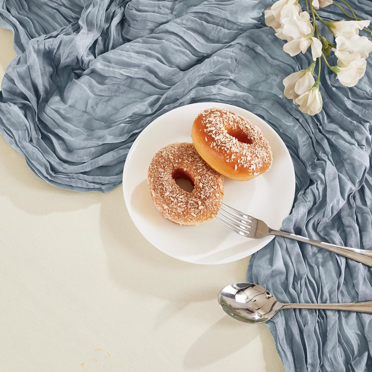 • PACKAGE INCLUDED: You will receive 6 pieces of dusty blue cheesecloth table runners. Elegant and beautiful design, exquisite workmanship. Product size: Each boho table runner is 35 x 120 inches. Enough to cover rectangles and round tables, as well as long tables that are stitched together. It can even be used to belt chairs decorate napkins, background curtains. Round or square tables for 8-10 people, perfect for romantic and elegant party events