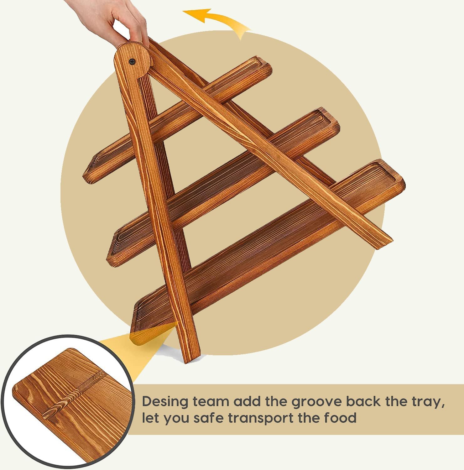 • Serving Tray Structure and Dimensions: This Serving Tray has a Detachable 3-tier structure,Stand with 3 rectangular trays of various sizes and 1 ladder rack,You can use it with the rack or use the wooden tray alone!The large tray 17" x 5.5" the medium tray 14"x 5.5" and the small tray 11"x 5.5",the ladder rack 13.46"x7"x17.04". accommodating a range of dessert sizes. The 4-inch spacing between tiers provides ample room for showcasing cakes, fruits, snacks, and other foods.