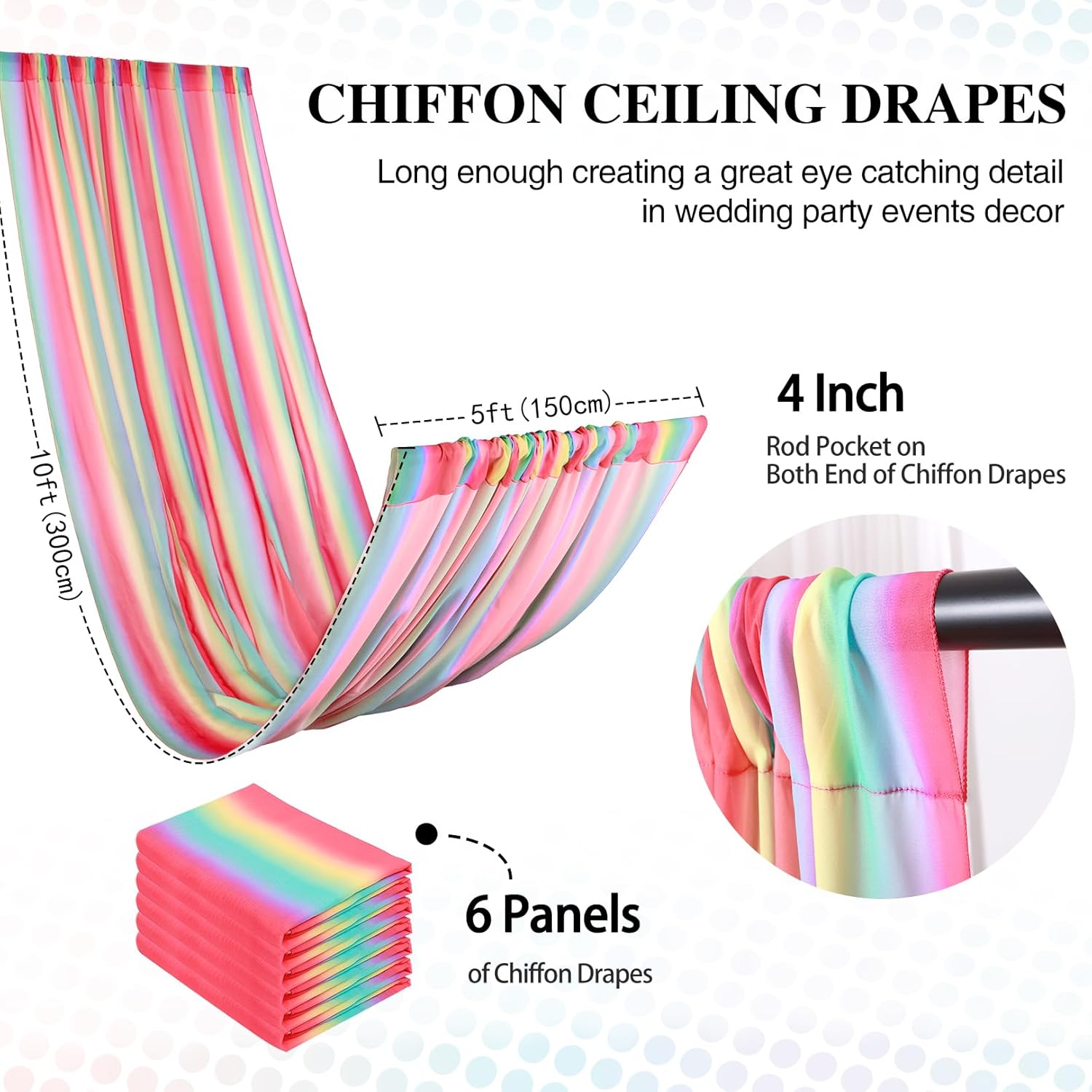 DUOBAO Rainbow Chiffon Wedding Ceiling 10FT Length Photo Background Curtain Decorations with Rod Pocket for Banquet Room Weddings Ceremony Graduation Prom, W 5' x L 10'-6 Panels Bright Rainbow