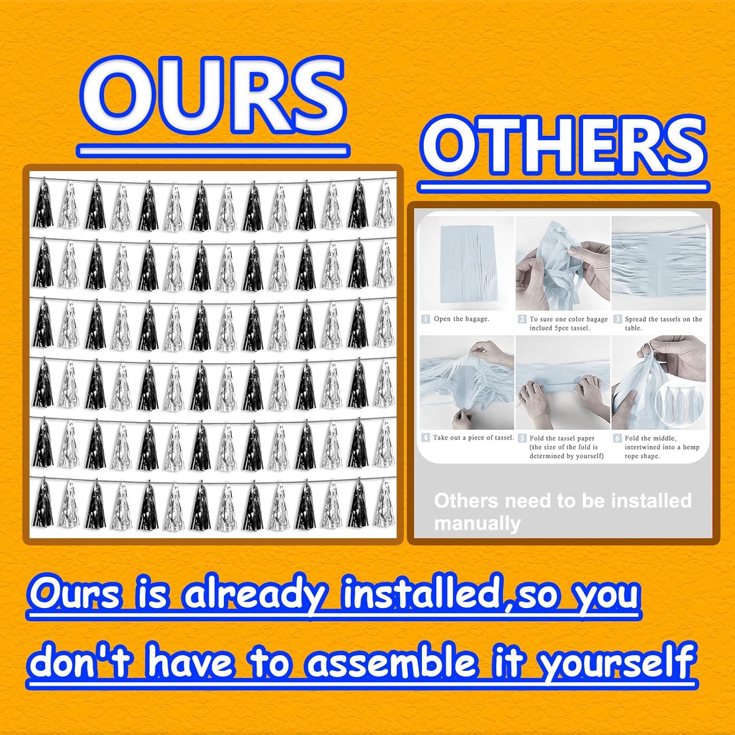 • 【Black Silver Beige Mint Gold Party Supplies Set】: The total length of the Black Silver beige mint gold birthday tassels banner is 39.4 feet, divided into 6 strips, each 9.8 feet long. Each banner contains 15 tassels, and each tassel measures 14 inches, for birthday decorations many occasions, and so on