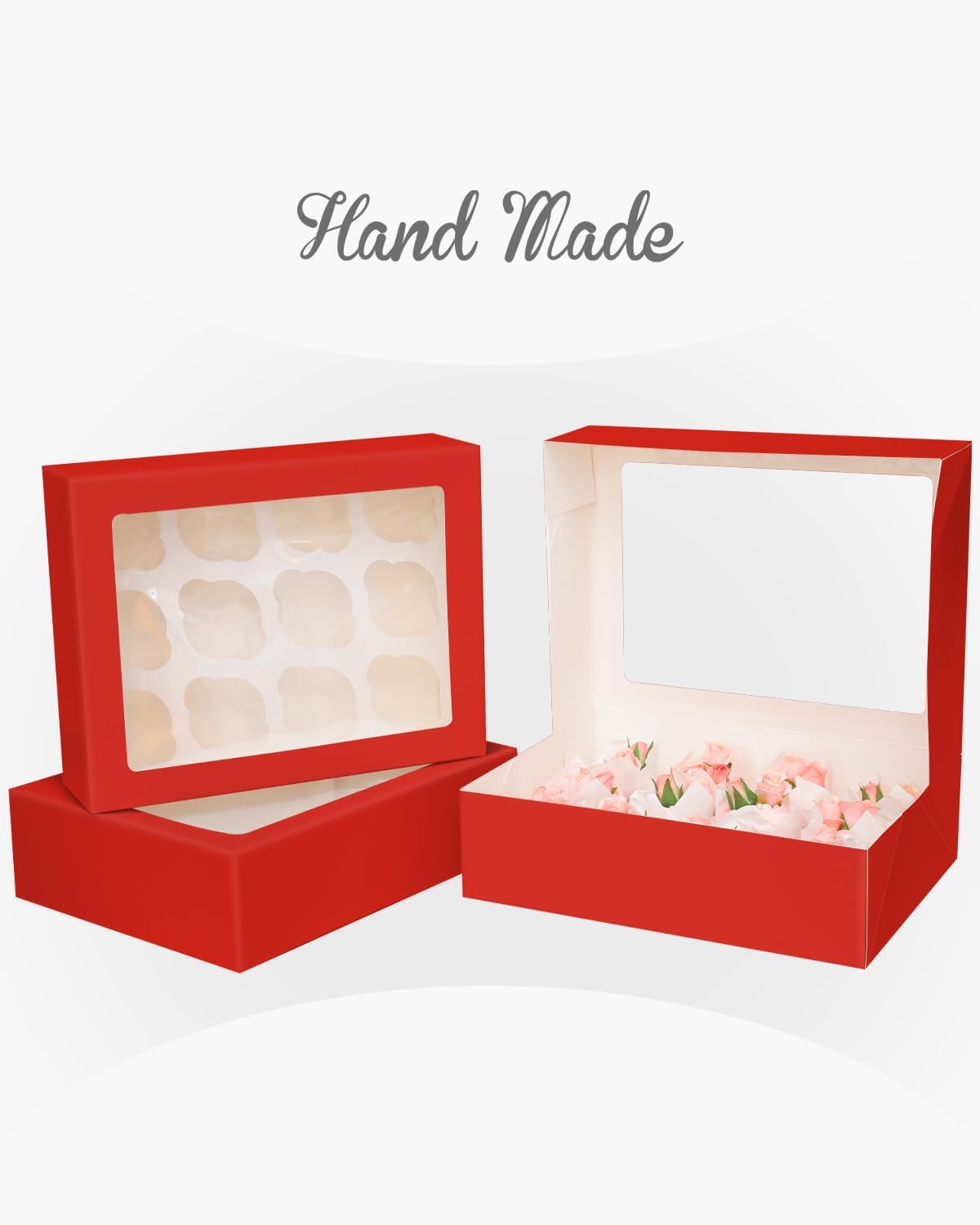 Bakepacker 12 Cupcake Containers 10-Packs Red Cupcake Box Cupcakes Carrier, 12 Cupcake Boxes with Window 13"x10"x3.5"(Auto-pop up)