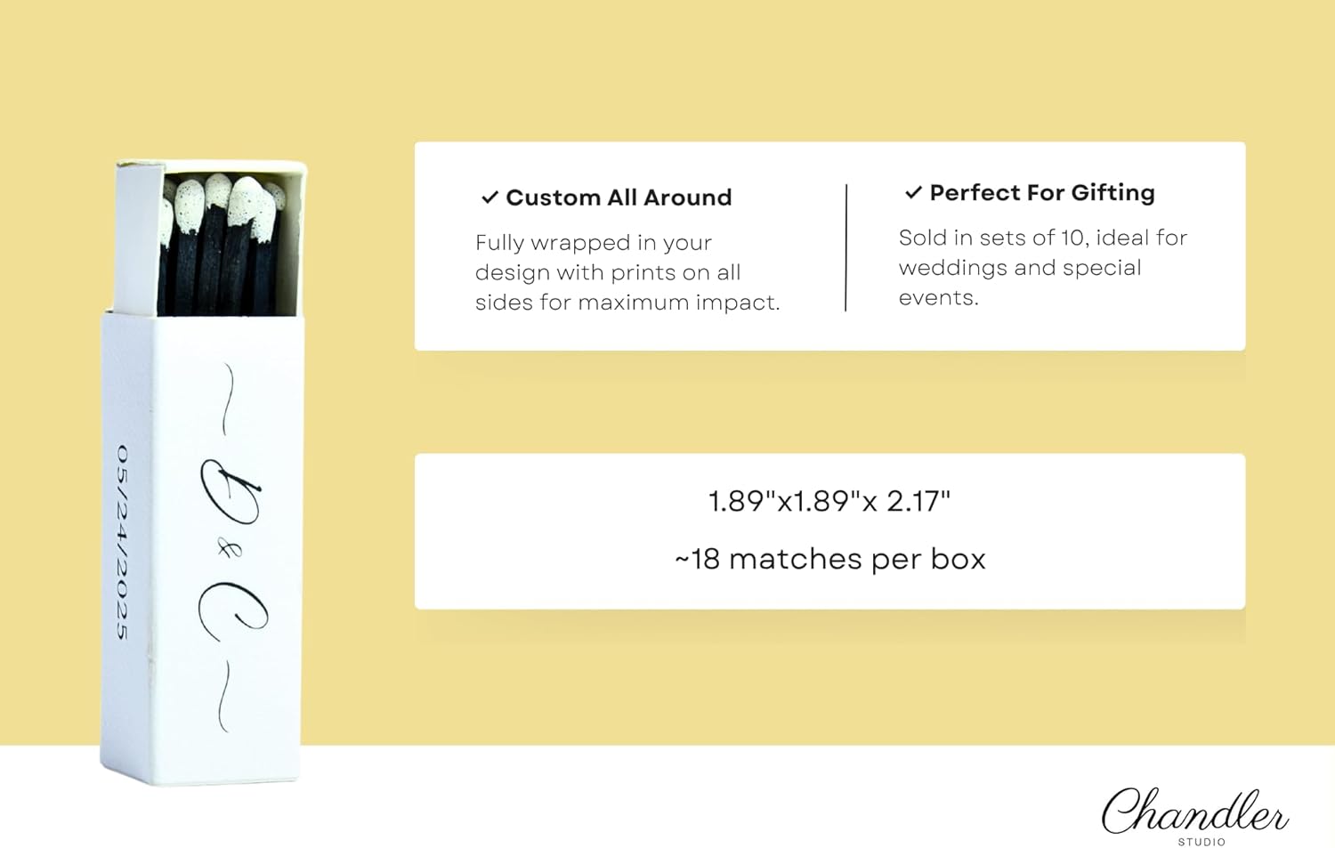 • Elevate your wedding with our Chandler Studio Custom Matchboxes, designed to add a personalized touch to your special day. Each set includes 10 matchboxes, perfect as unique wedding favors that your guests will love. Customize each matchbox with names, dates, or special messages to create memorable keepsakes that reflect your personal style.