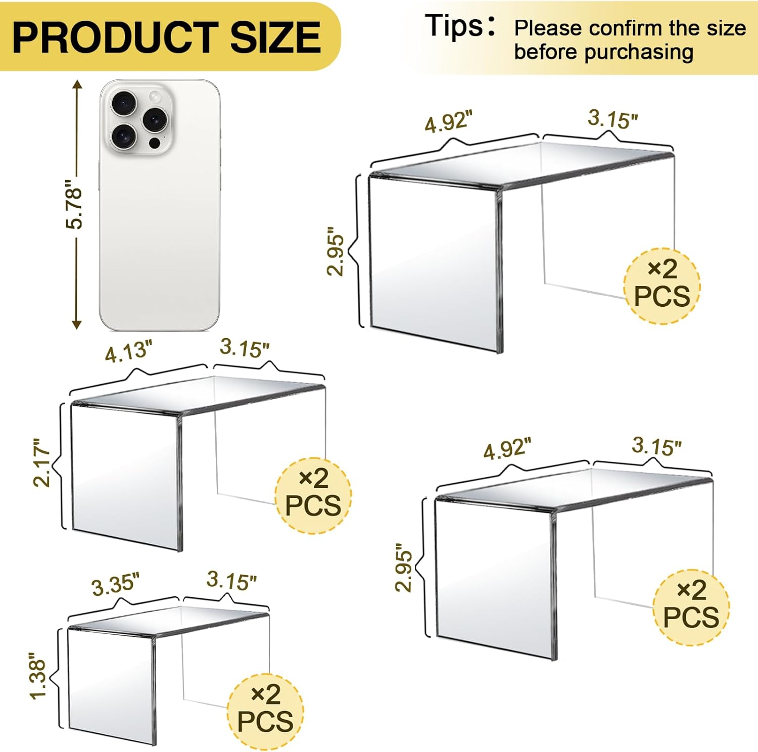 • SIZES INCLUDED: Four sizes of clear shelf risers (two acrylic display risers in each size), including 8 clear display shelves, the sizes are 3.3*3.1*1.3 inches, 4.1*3.1*2.1 inches, 4.9*3.1*2.9 inches and 5.7*3.1*3.7 inches. The 4 different heights of acrylic display risers can be displayed together like steps, arranged separately, or staggered to display your collections