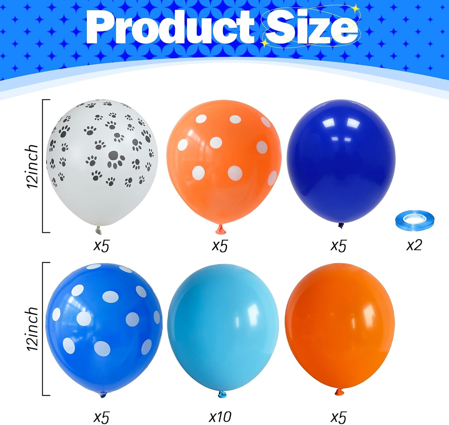 • 🦴 Blue and Orange Balloons Set: This is a beautiful bright balloon, which contains balloons of different colors. Include 12 inch dog paw print balloon(5pcs), light blue balloon(10pcs), royal blue balloon(5pcs), orange balloon(5pcs), orange white print balloon(5pcs), dark blue white print balloon(5pcs), 2 rolls of ribbons. You can use these different shades of blue and orange balloon kits, DIY balloon combinations to create your birthday party.