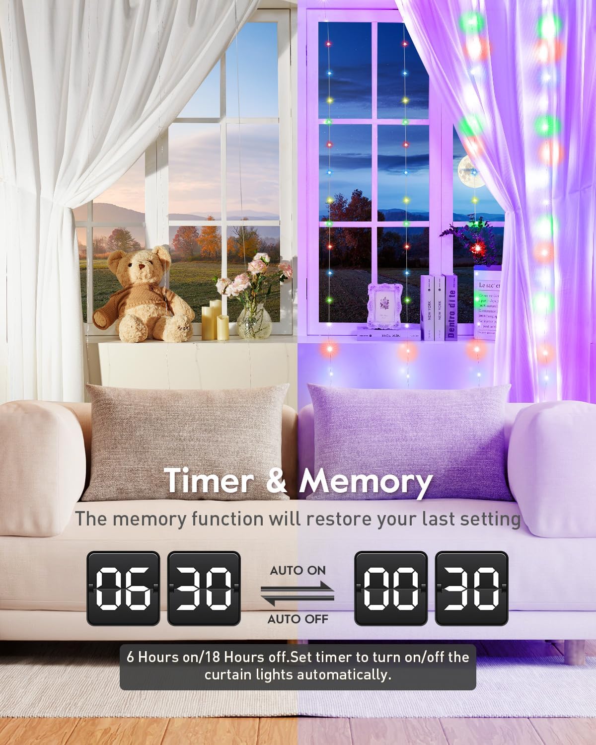 • [ Memory & Timer Functions ] - Brightown Bluetooth Smart Curtain Lights include a memory function that remembers your last setting and a timer function, which can be set through the app or remote to automatically turn the lights on/off for energy efficiency