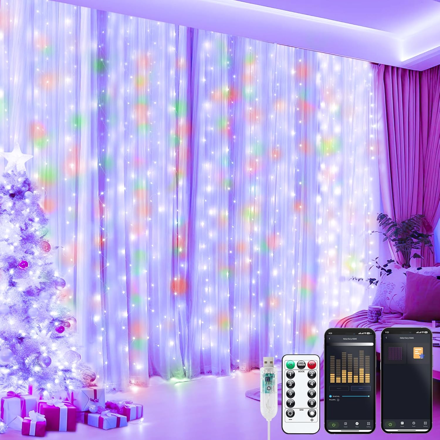 Brightown Smart Curtain String Lights - 9.8ft 300 LED Fairy Lights with APP Remote, 8 Modes, USB Powered Waterproof Christmas Hanging Lights for Bedroom Wedding Party, Multicolor