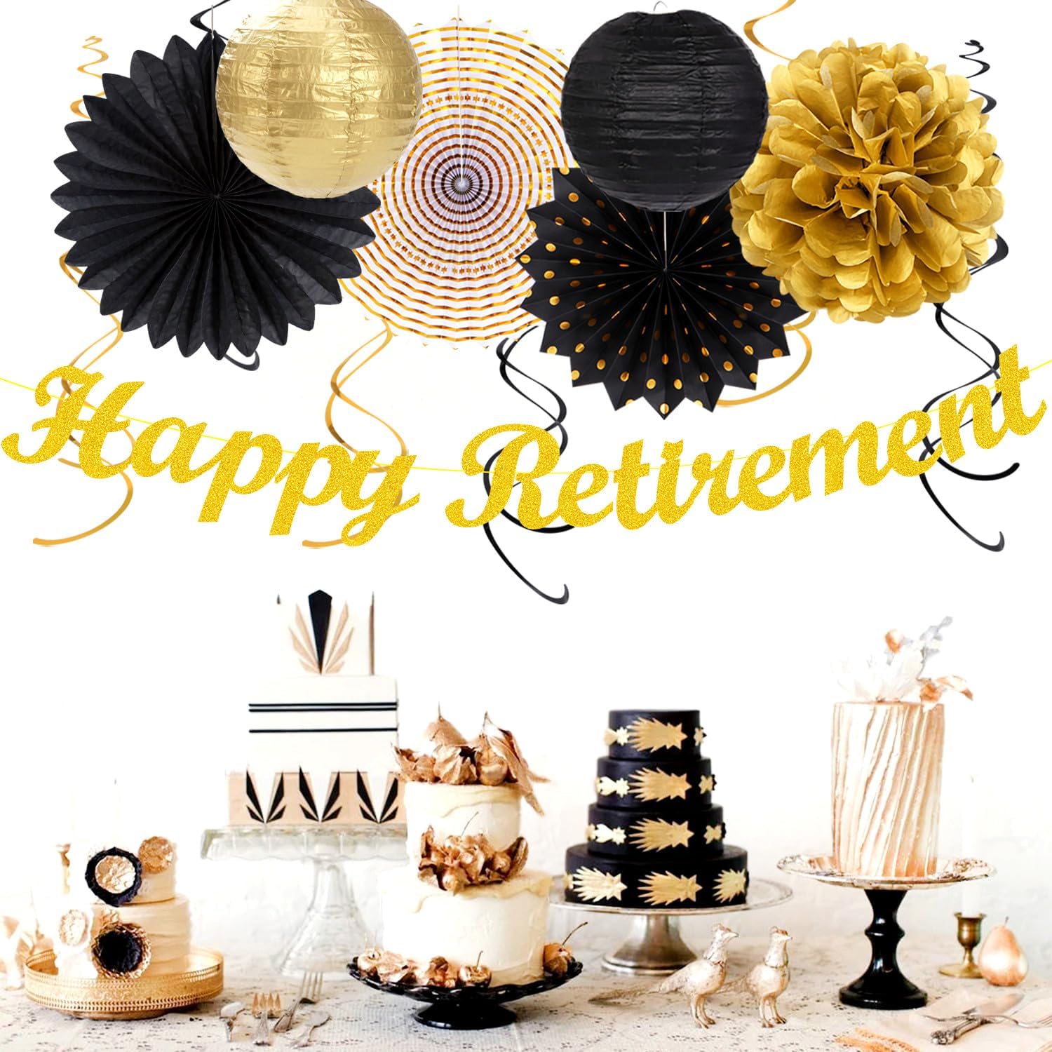 • 【Black Gold Retirement kits】This kits include 1pcs happy retirement banner, 1pcs circle dots paper banner, 4pcs tissue pom poms: 3pcs 10" and 1pcs 12" , 3pcs 8inch paper honeycom ball, 2pcs 8inch paper lantern, 4pcs 12inch paper flower fan, 6pcs Paper swirls hanging streamers