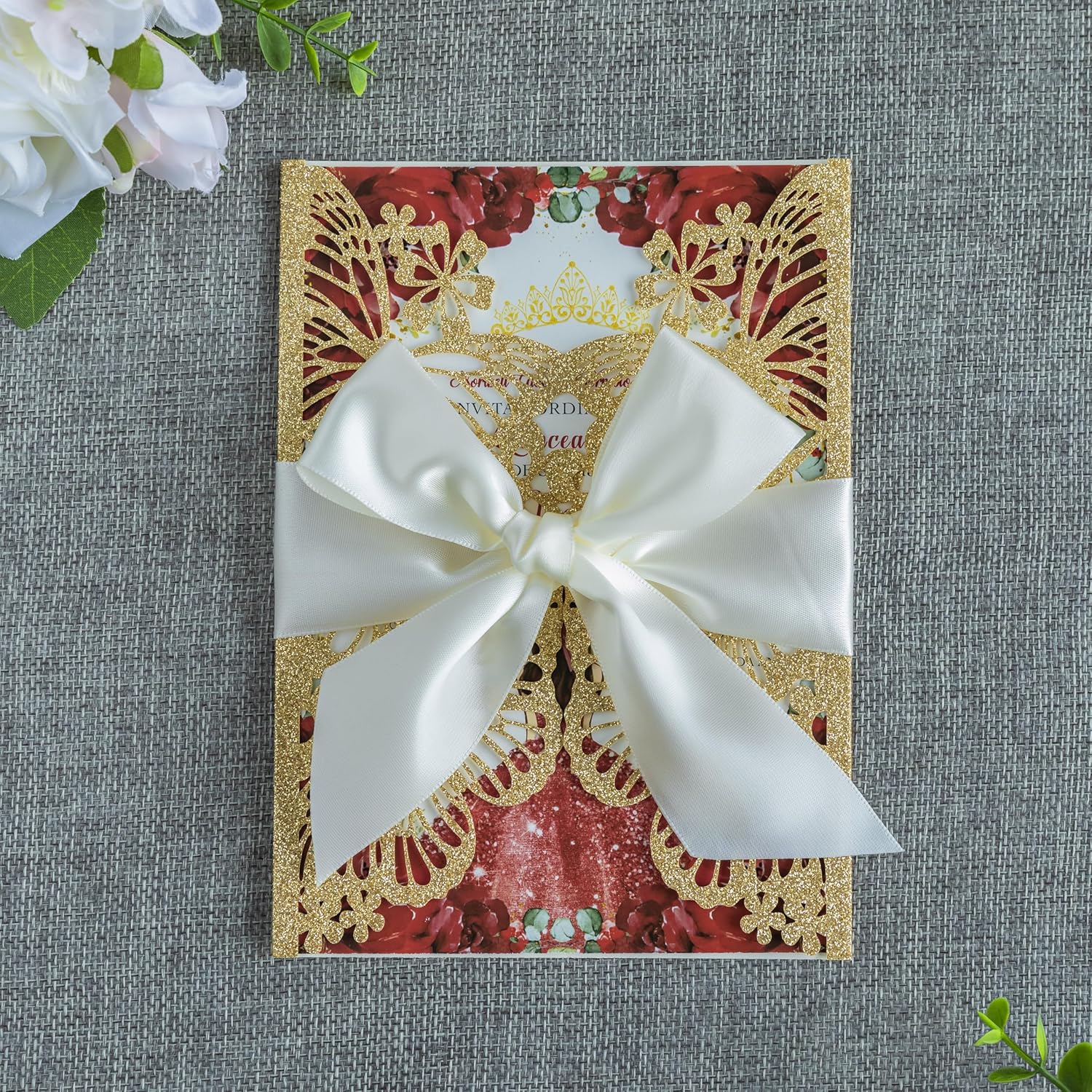 • Package include: 20 x Envelopes, 20 x Laser cut invitation cards, 20 x Blank inner sheets, 20 x ribbons.