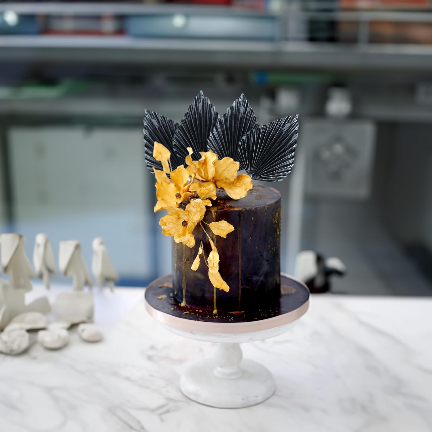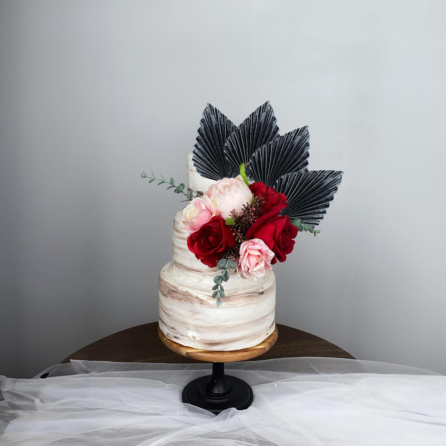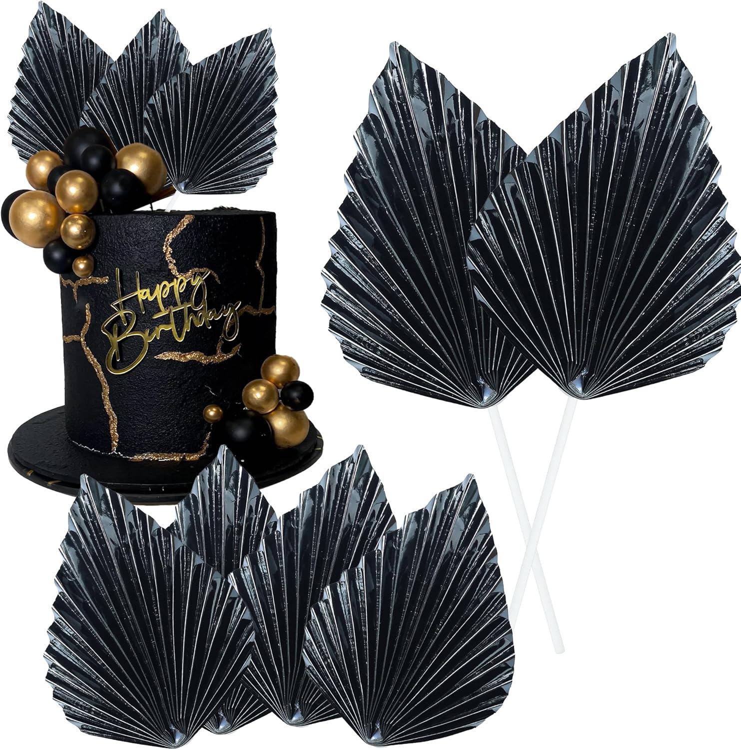 Gyufise 6Pcs Paper Palm Fan Cake Toppers Palm Spear Leaves Fan Cupcake Toppers Cake Insert Decorations Craft DIY Cake Bakeware Decoration for Birthday Party Wedding Party Decor Supplies Light Black