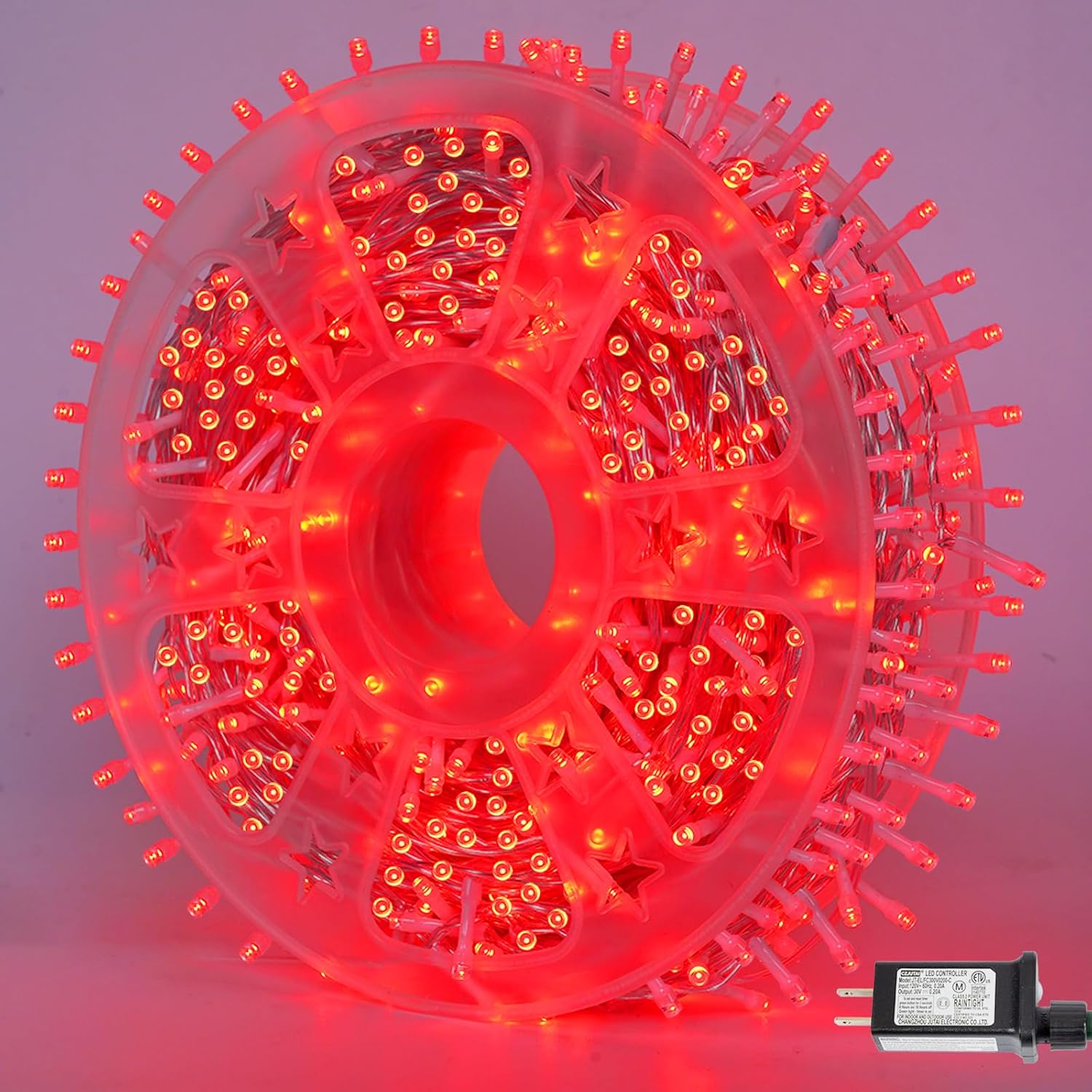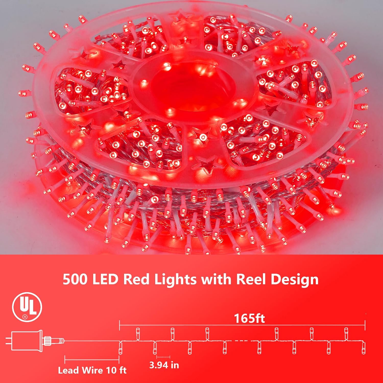 • Specification of 500 LED String Lights: Length of leading wire: 10.2ft, String length with led: 165ft, Space between LEDs: 3.94 in, Output: 30V low voltage.