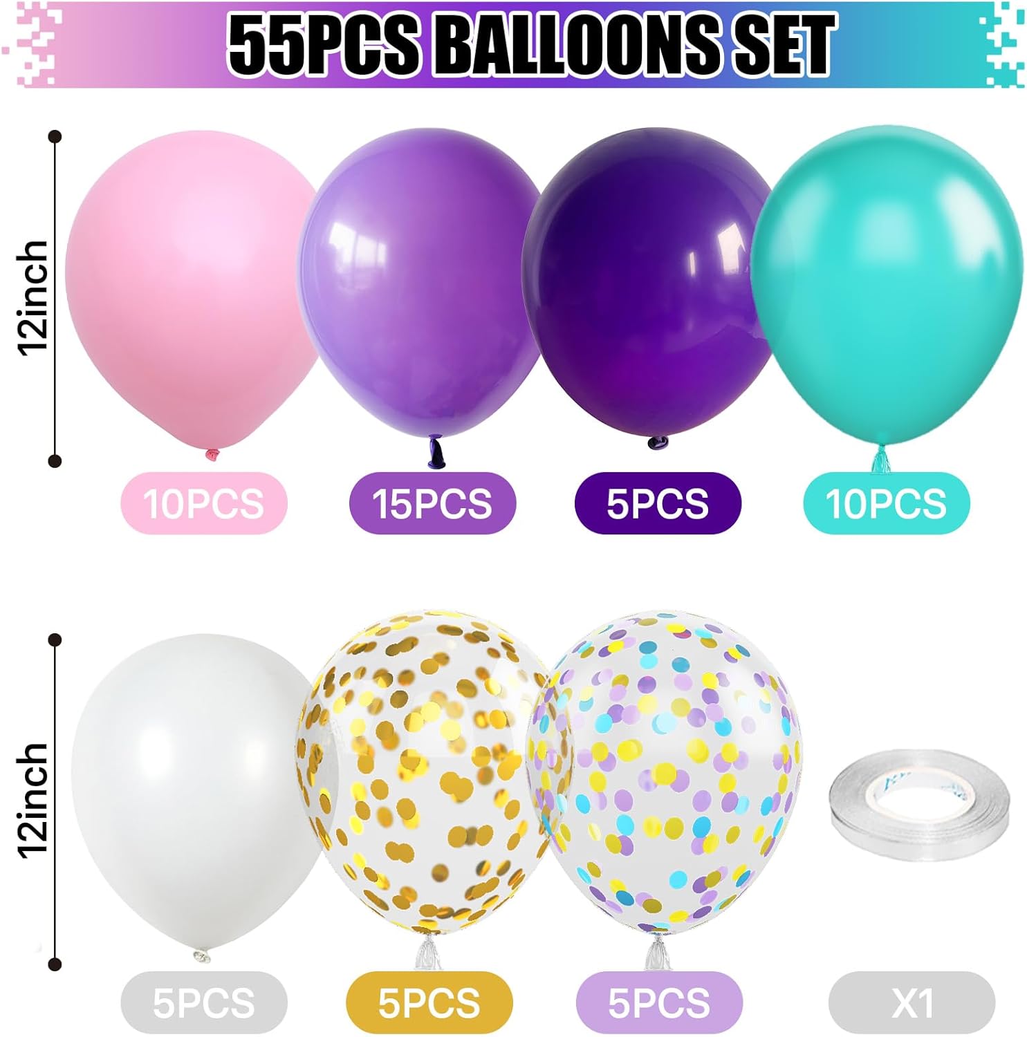 • 🎈12INCH BLUE PINK PURPLE BALLOONS: The package includes 55 pcs 12 inch balloons: 5 pcs gold confetti balloons, 5 pcs teal purple gold confetti balloons, 5 pcs dark purple balloons, 15 pcs purple balloons, 10pcs pink balloons, 5 pcs white balloons, 10pcs teal balloons and 1pc 10m ribbon. Enough quantity and different colors for satisfying your various decoration needs!