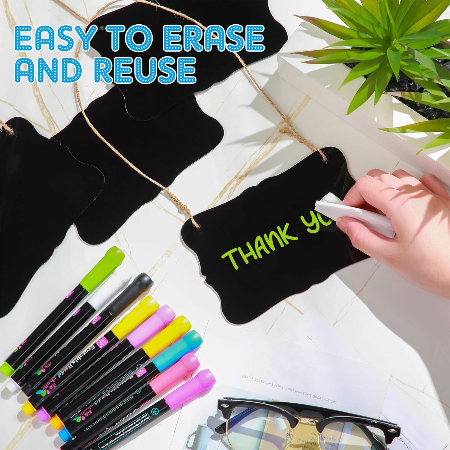 • Complete Set: when you buy this product, you not only get 12 chalk board, but also a set of 9 colorful liquid chalks, 9 colors, bright and easy to remove; Compared with traditional chalk, there is no dust flying, creating a healthier and more comfortable writing environment, which is a very cost effective choice
