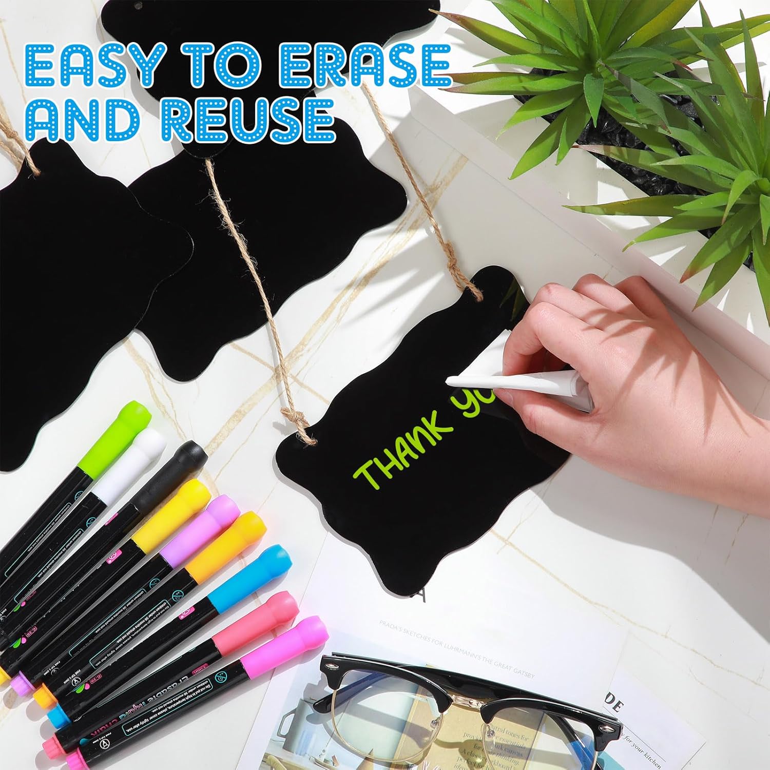 • Complete Set: when you buy this product, you not only get 12 chalk board, but also a set of 9 colorful liquid chalks, 9 colors, bright and easy to remove; Compared with traditional chalk, there is no dust flying, creating a healthier and more comfortable writing environment, which is a very cost effective choice