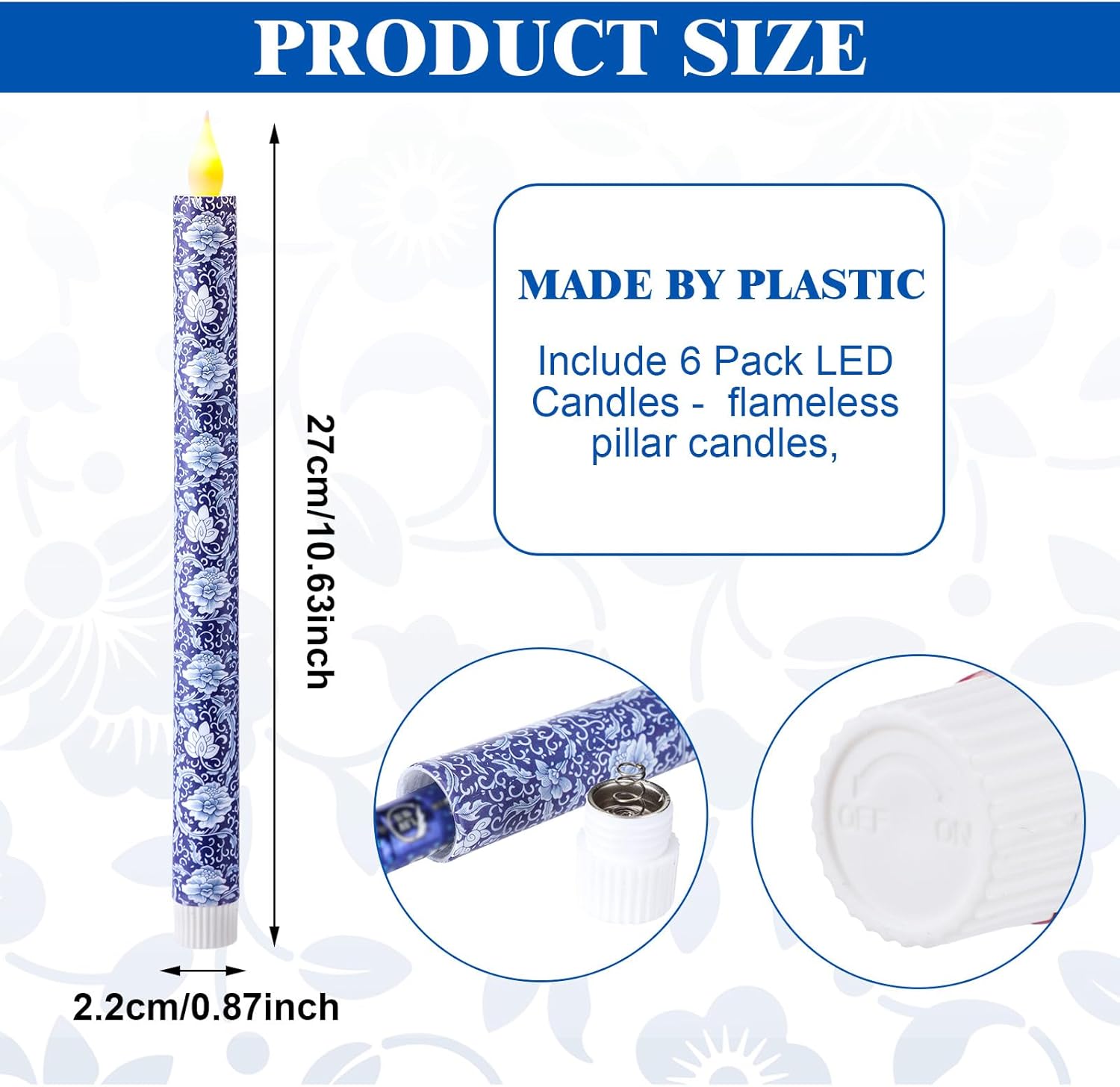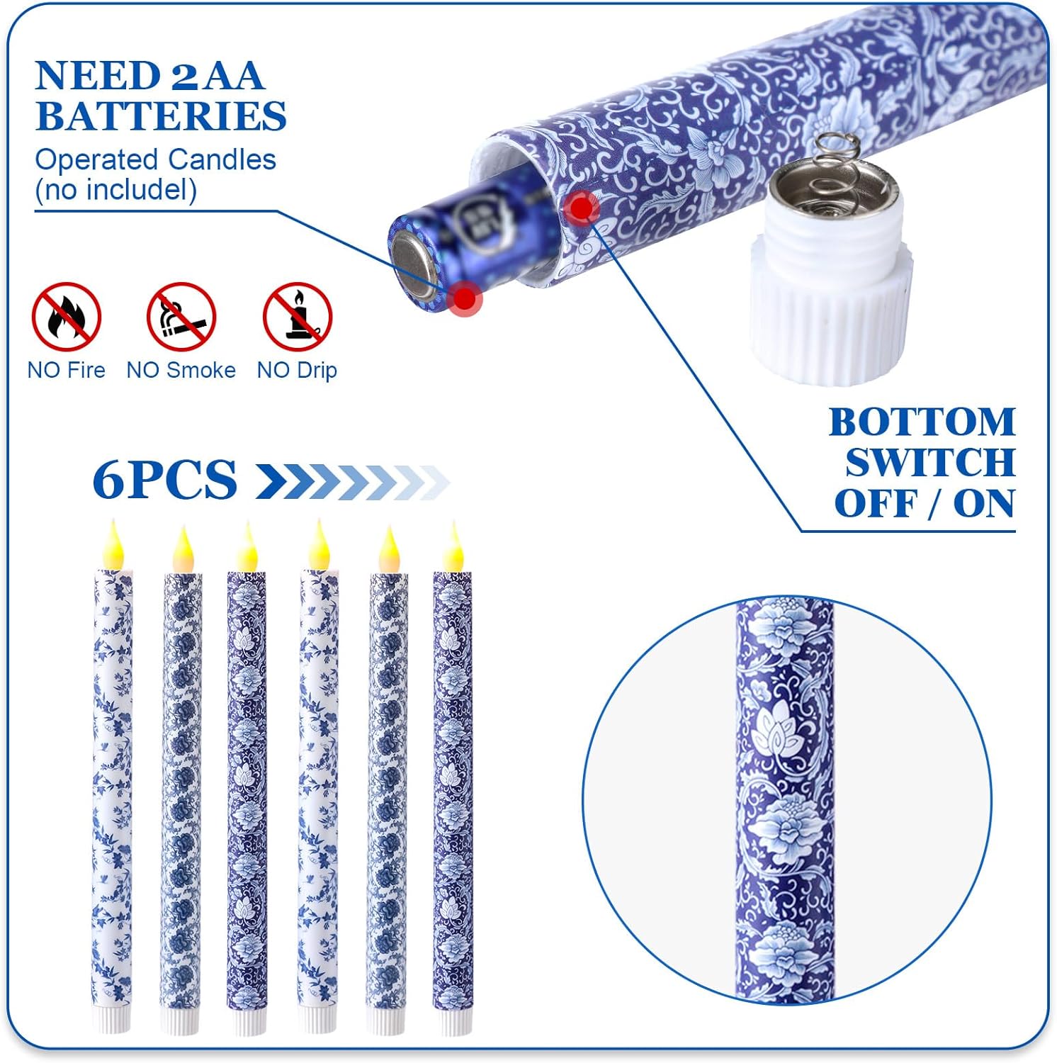 • Christmas Candles Set: come with 6 pcs chinoiserie themed flameless candles with blue and white intricate floral designs for festive decor; Each candle requires 2 AAA batteries (not included) to operate, the remote control is not included