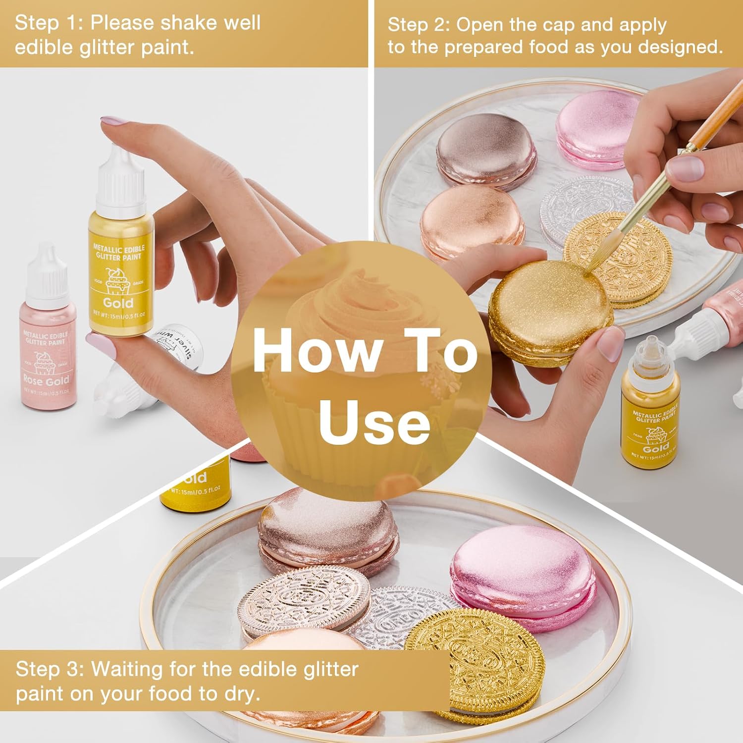 Edible Glitter Paint Set- 6 Color Food Coloring Metallic Glitter Paint for Baking, Cake Decorating - Food Grade Art Decorative Cake Paint for Cupcakes, Cookies, Fondant, Donuts, Macaron, Candy (metal, 6 color)