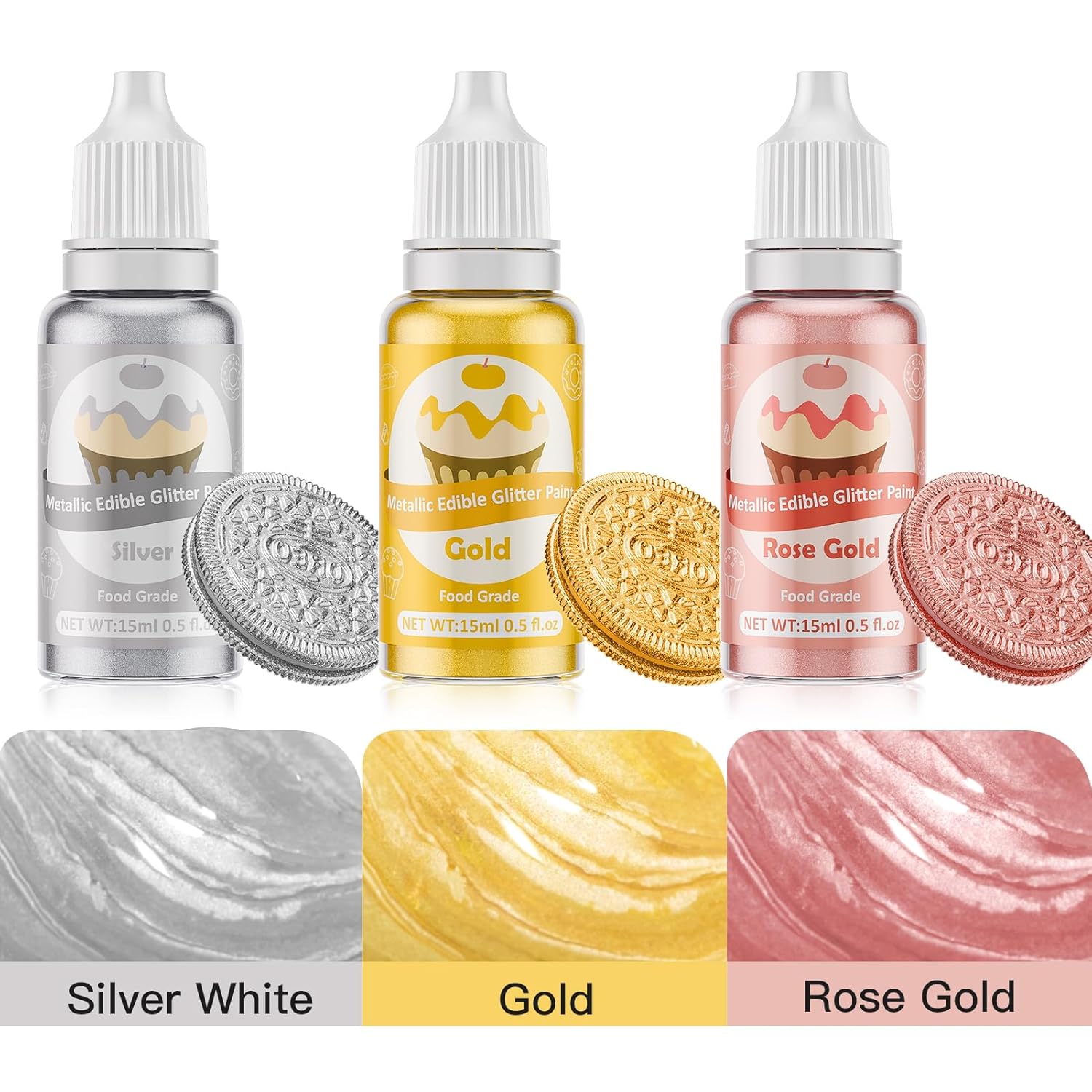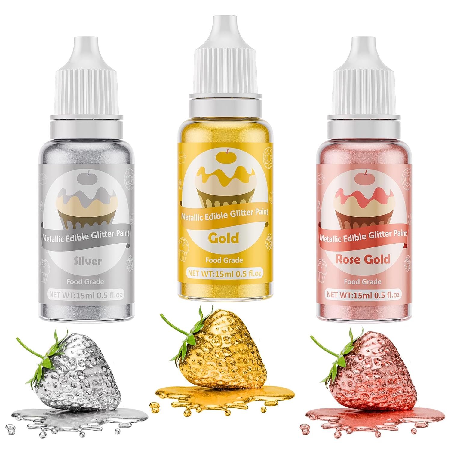 Edible Glitter Paint - 3 Colors Glitter Decorative Cake Paint Metallic Glitter, Food Grade Paint Edible Paint for Cake Decorating, Baking, Candy, Cookie, Chocolate -0.5 fl.oz(15ml)/Bottle (Gold, 3 color)