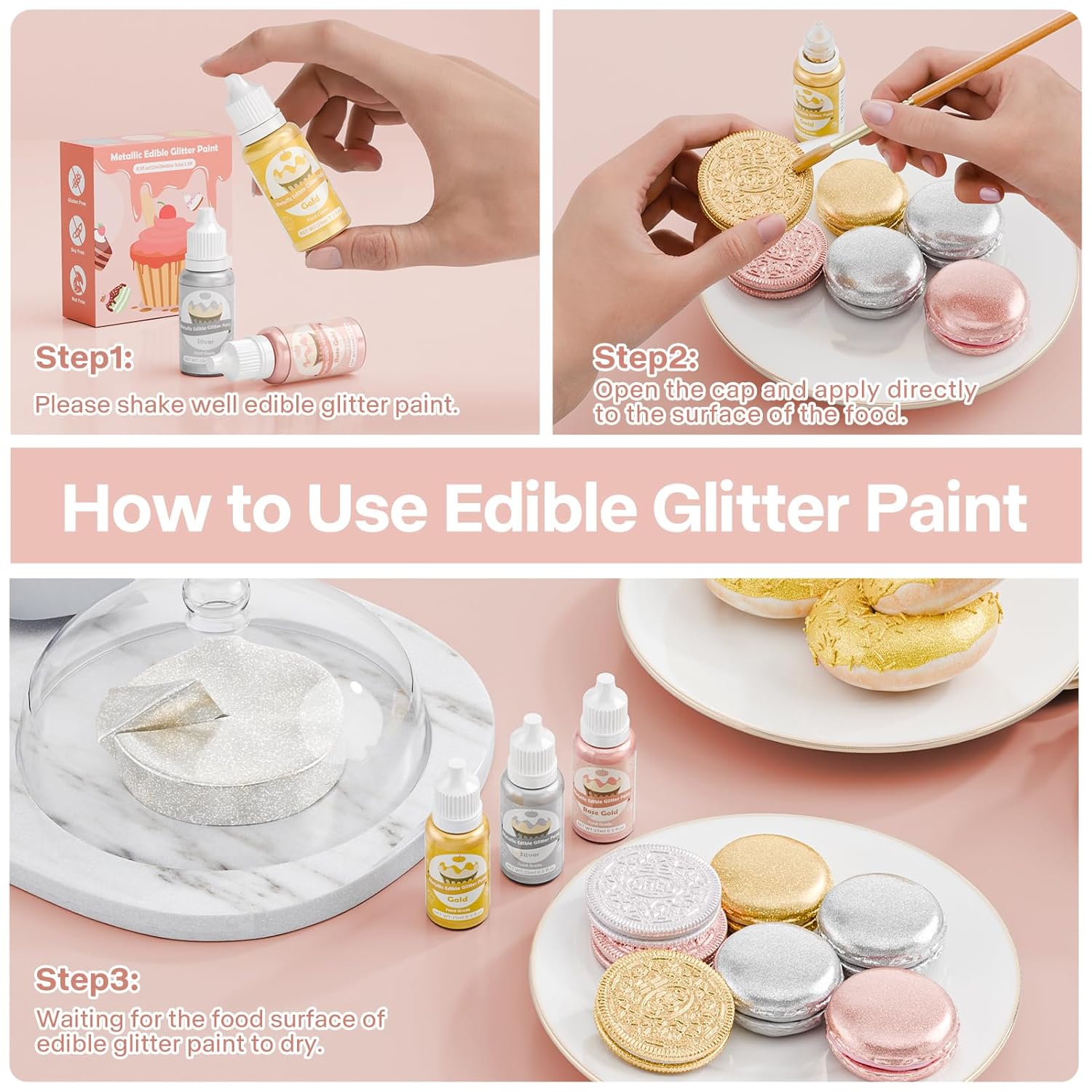• Metallic Edible Glitter Paint Set: Our cake paint is specially crafted for food and baking decoration to create a high luster glitter effect, perfect for adding a touch of metallic finish to your cake decorating projects. 3 vivid color can be choose: Gold, Rose Gold, Siliver. All colors looks amazing and beatiful!