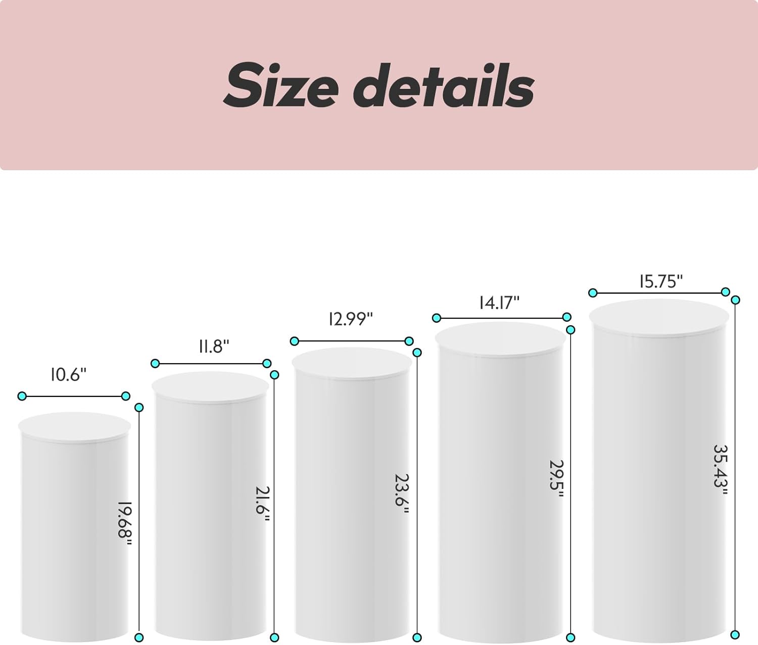 • 5Pcs Round Cylinder Stand Pedestal: Large cylinder pedestal stands for parties includes five white column stands, 15.7*35.43''(L),14.17*29.5''(M),12.99*23.6''(S), 21.6*11.8"(XS), 19.68*10.6"(XXS). Five different sizes of cylinder pedestal display plinth pillars to give you full choice.