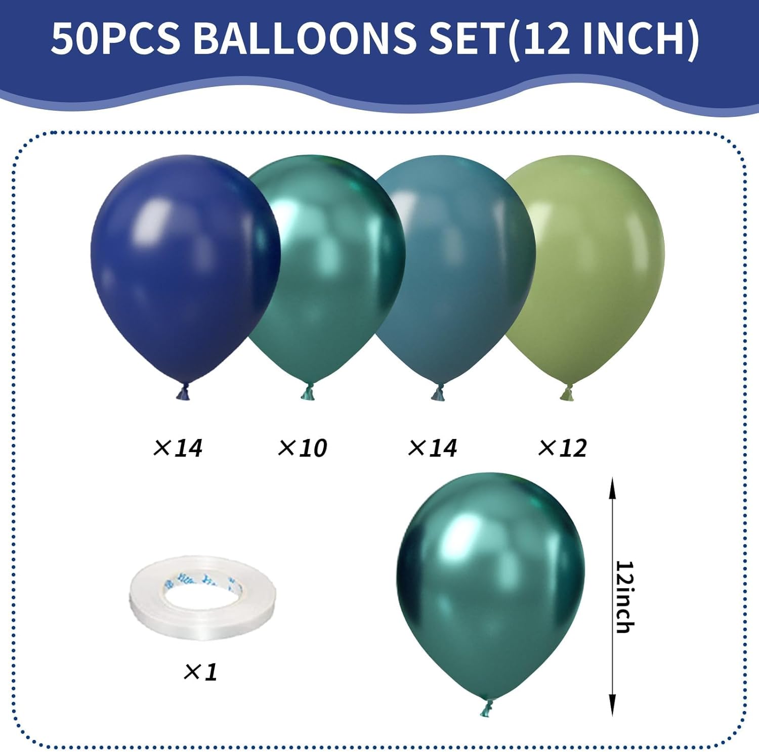 Blue and Green Balloons, 50Pcs 12 Inches Dark Green Navy Blue Metallic Dinosaur Birthday Balloons for Boys Dinosaur Birthday Party Hunting Baby Shower Wedding Graduation Decorations