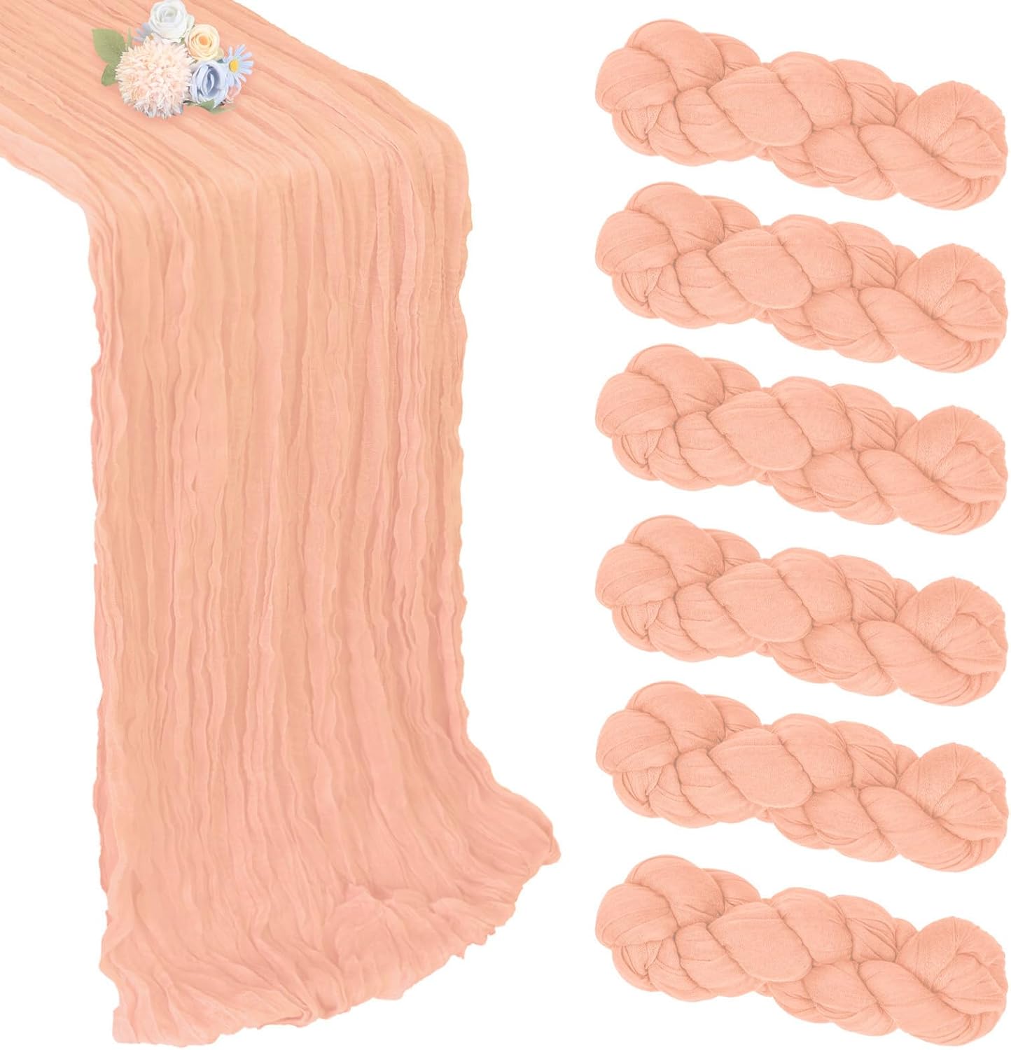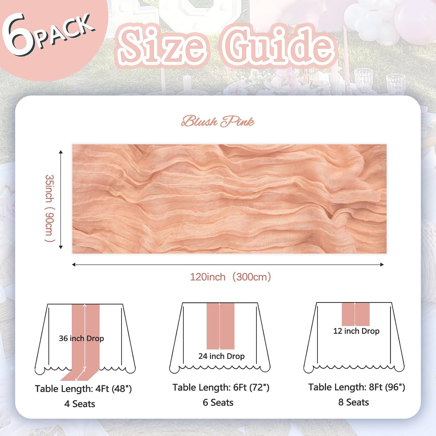 6 Pack Blush Pink Cheesecloth Table Runner 10ft Boho Gauze Fabric Cheese Cloth Table Runner 35 x 120 Inch Rustic Sheer for Romantic Wedding Decor Baby Shower Party Table Centerpiece Decoration