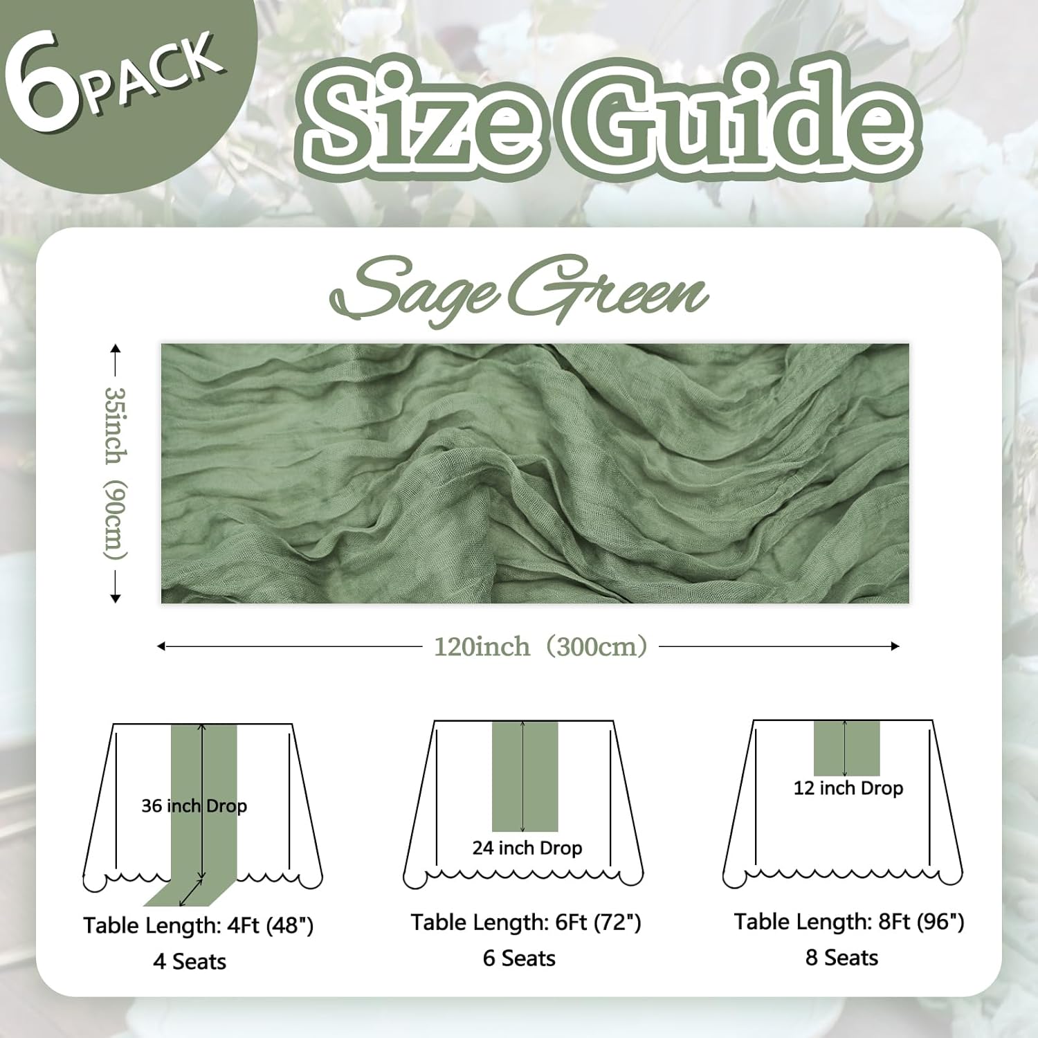 • 【Package Included】You Will Be Delighted To Receive 6 Packs Of Sage Green Table Runner. The Sage Green Cheesecloth Table Runner Quantity Is Abundant, Fully Meeting Your Daily Use And Various Event Needs. The Size Of The Table Runners Is 35 x 120 Inch, Which Can Perfectly Fit Tables Or Chairs In Various Event Scenarios. Besides, We Have Carefully Prepared A Wide Range Of Color Options For You, Which Are Highly Suitable For Creating A Romantic And Extraordinary Atmosphere.