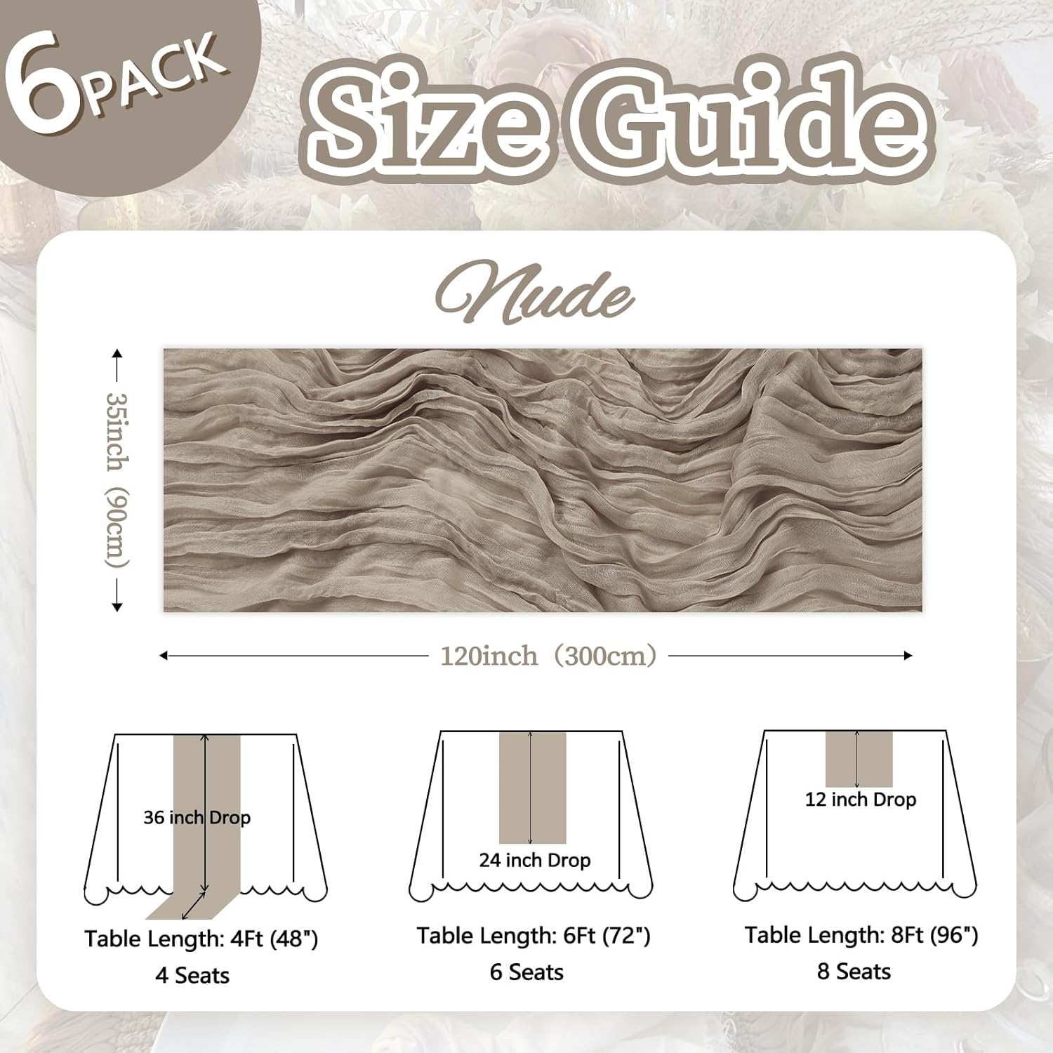 • 【Package Included】You Will Be Delighted To Receive 6 Packs Of Nude Table Runner. The Nude Cheesecloth Table Runner Quantity Is Abundant, Fully Meeting Your Daily Use And Various Event Needs. The Size Of The Table Runners Is 35 x 120 Inch, Which Can Perfectly Fit Tables Or Chairs In Various Event Scenarios. Besides, We Have Carefully Prepared A Wide Range Of Color Options For You, Which Are Highly Suitable For Creating A Romantic And Extraordinary Atmosphere.