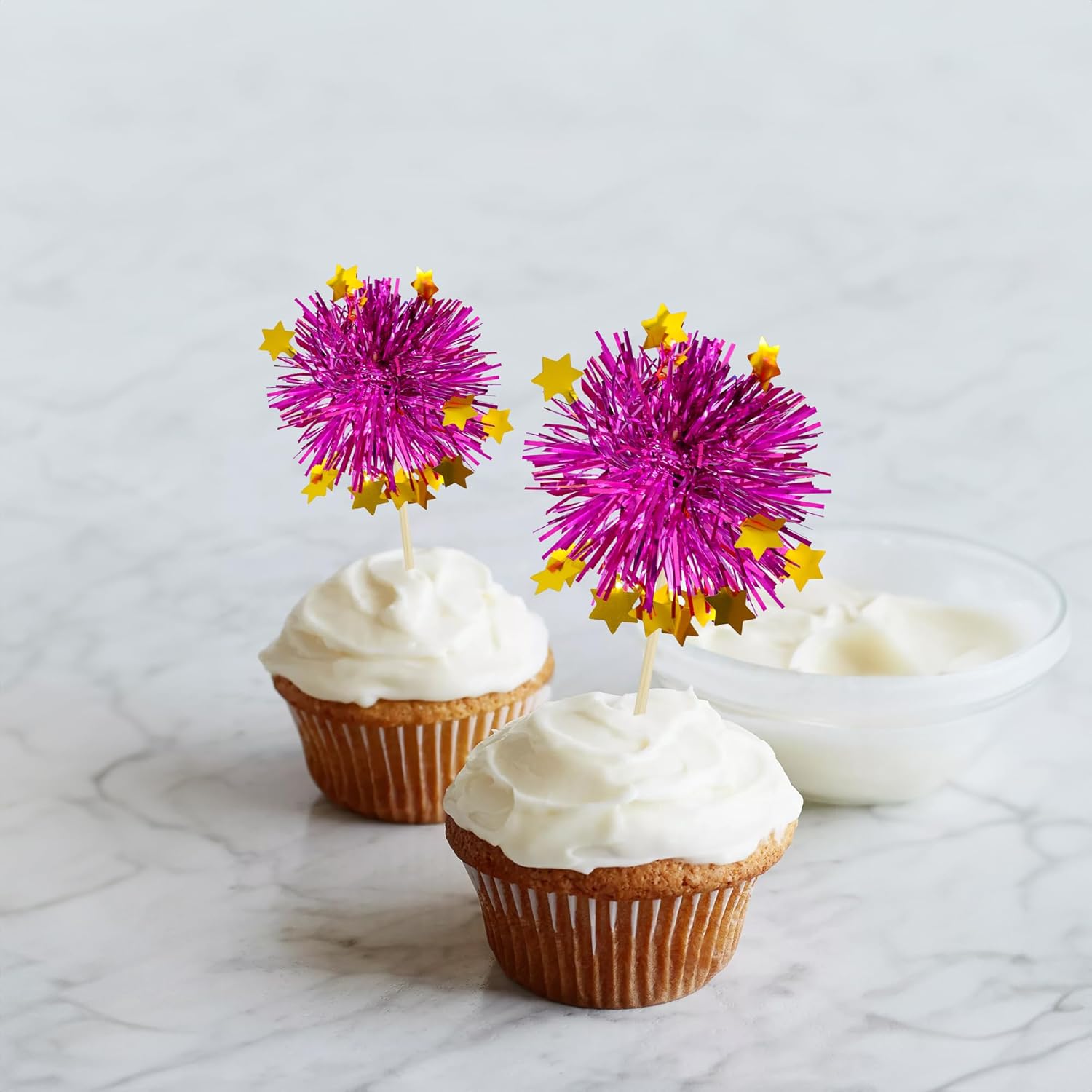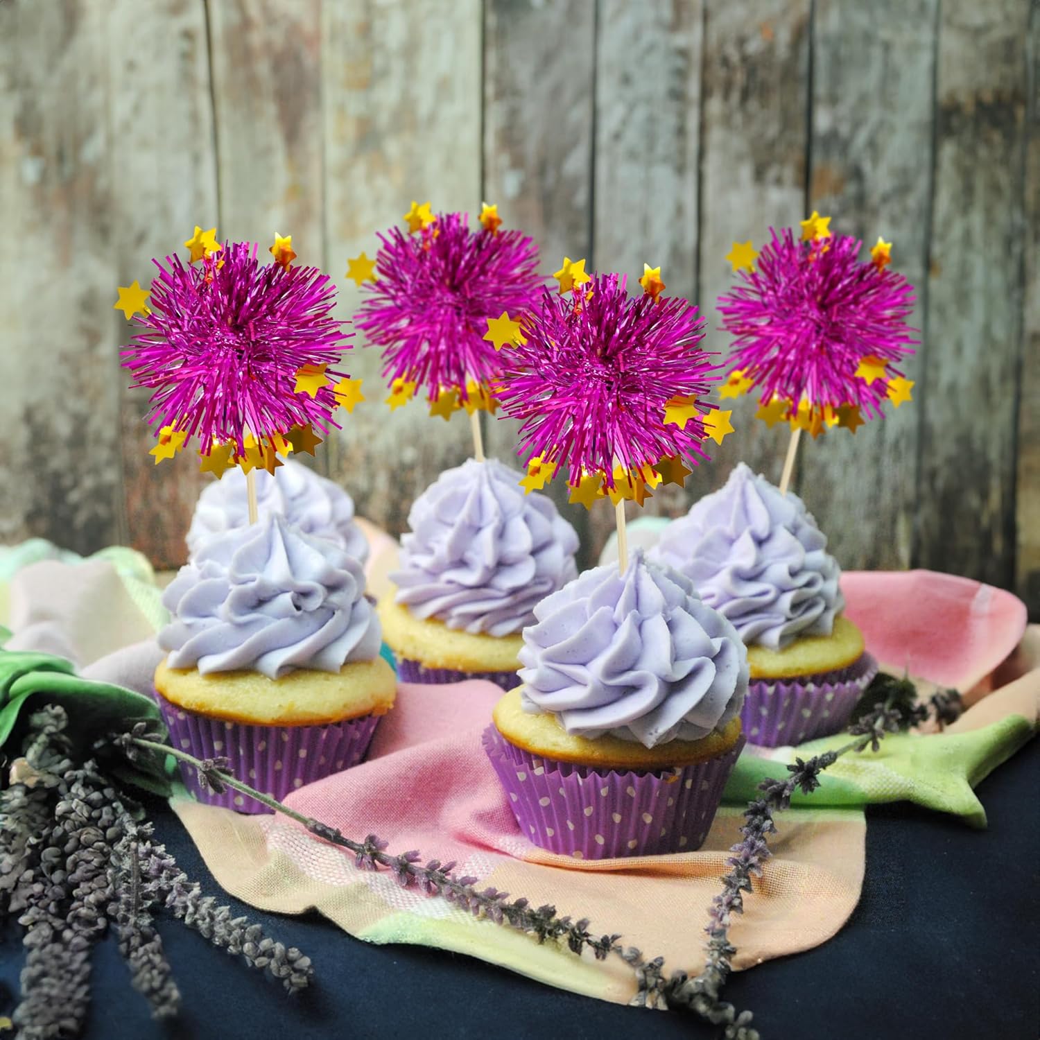 Ephlyn 30Pcs Foil Firework Cupcake Toppers Party Birthday Cake Toppers Supplies Sparkle Tinsel Cocktail Fruit Toothpick for Birthday Wedding Graduation Party Purple