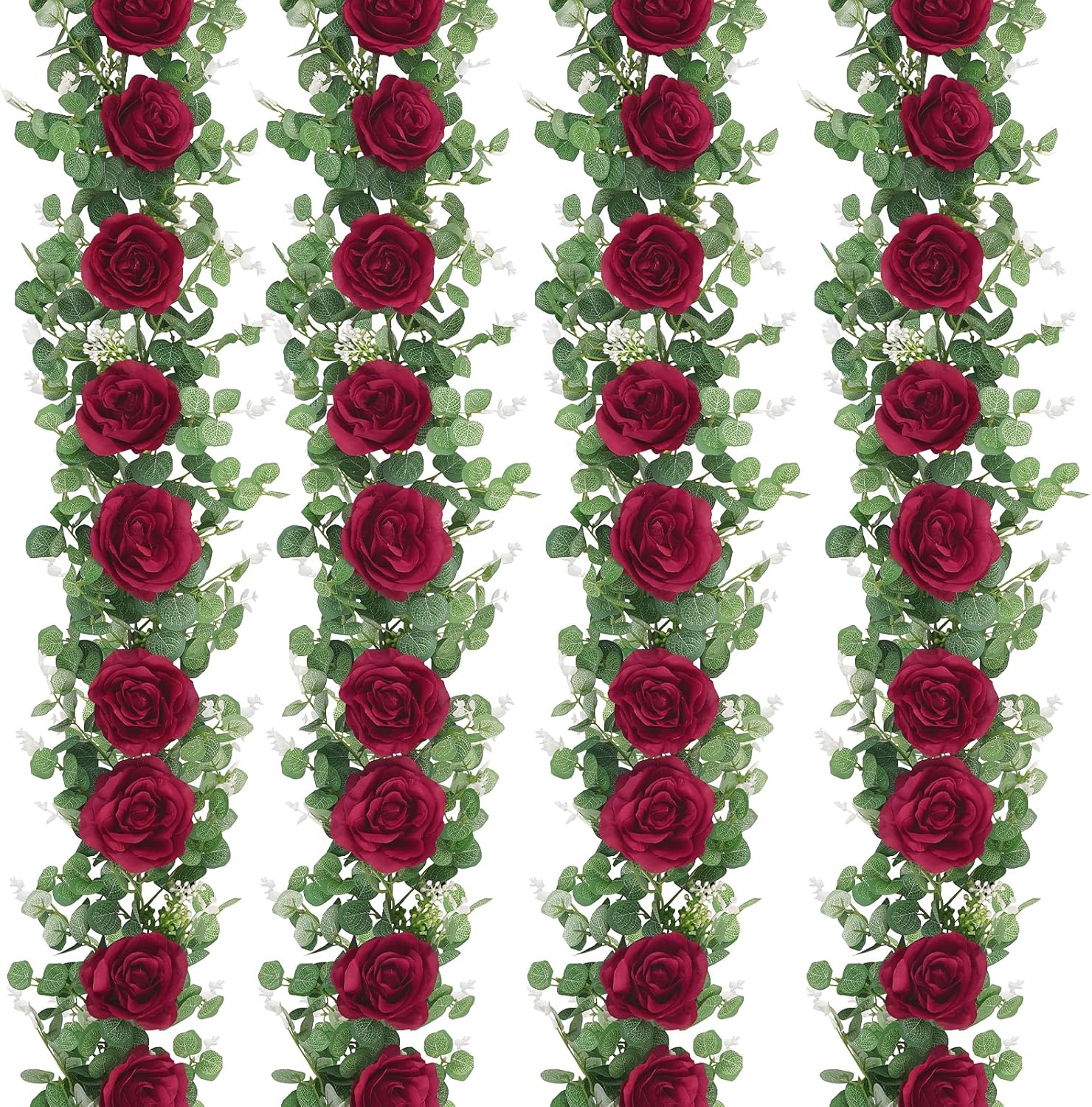 Dolicer 4Pcs 26Ft Artificial Eucalyptus Garlands with Flowers - 8 Roses, Faux Floral Greenery Garlands Fake Flowers Vines for Wedding Table Centerpieces Arch Party Ceremony Backdrop Decor (Red)