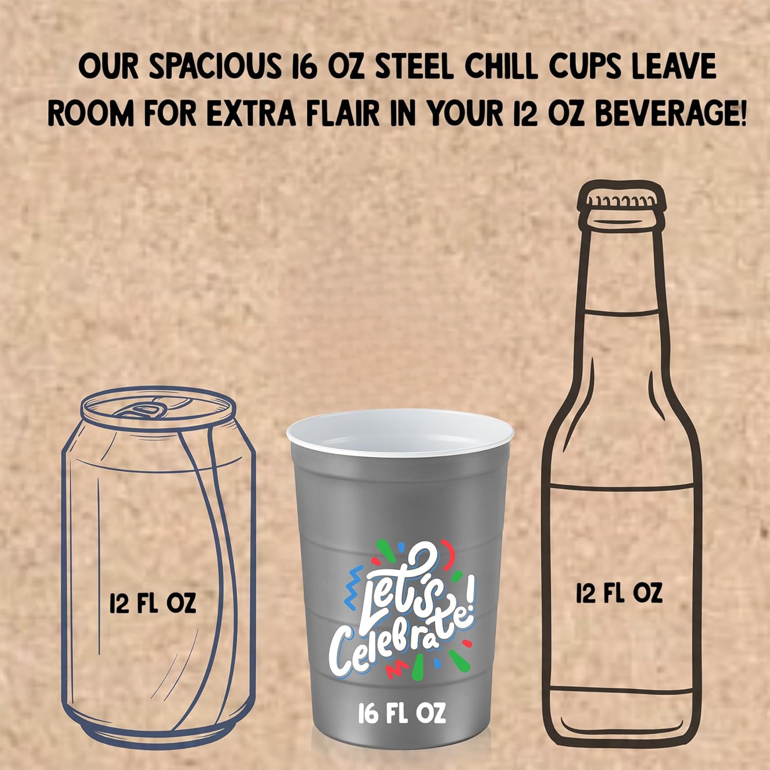 • Versatile Party Cup: Featuring "Let's Celebrate" on one side and "Let's Party" on the other, our party cups are 16-ounce capacity, just right size for a chilled drink; easy to recycle