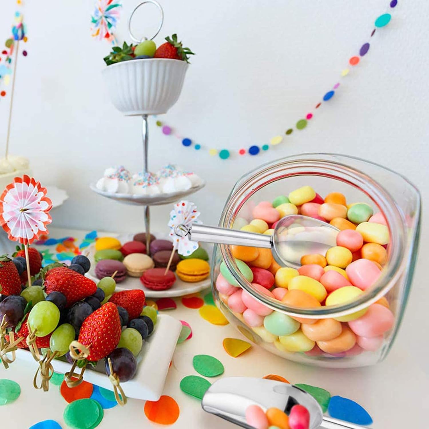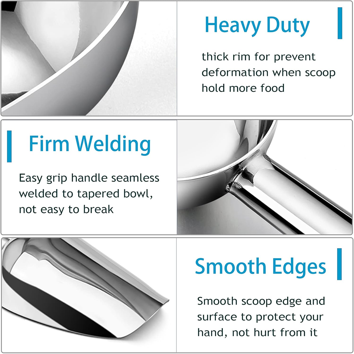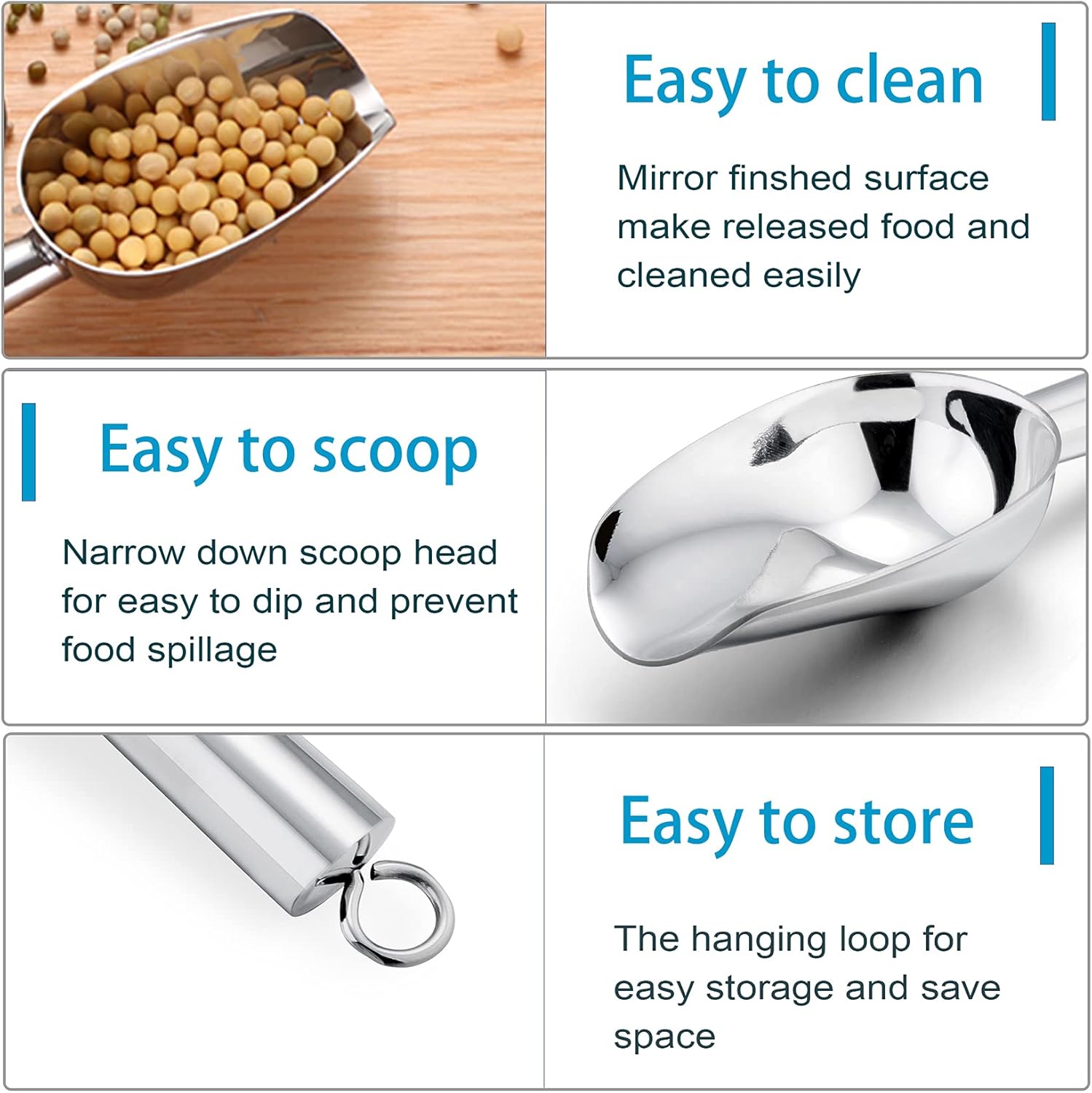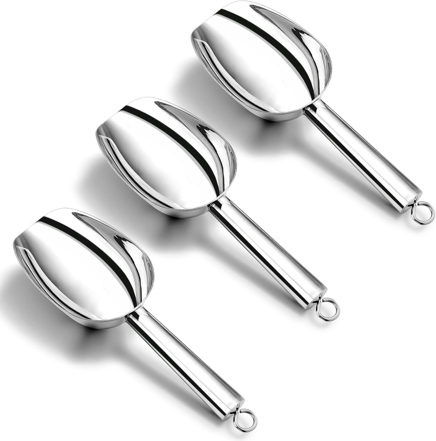 • 【Decorative & Versatile】The shiny silver scoop could match different styles of kitchens, Elegant appearance could be a embellishment to your kitchen, 3 piece set would meet your any needs, Scooping from ice cubes, candy, coffee bean to dry food, And even pet food, Great for a wide range of use in home