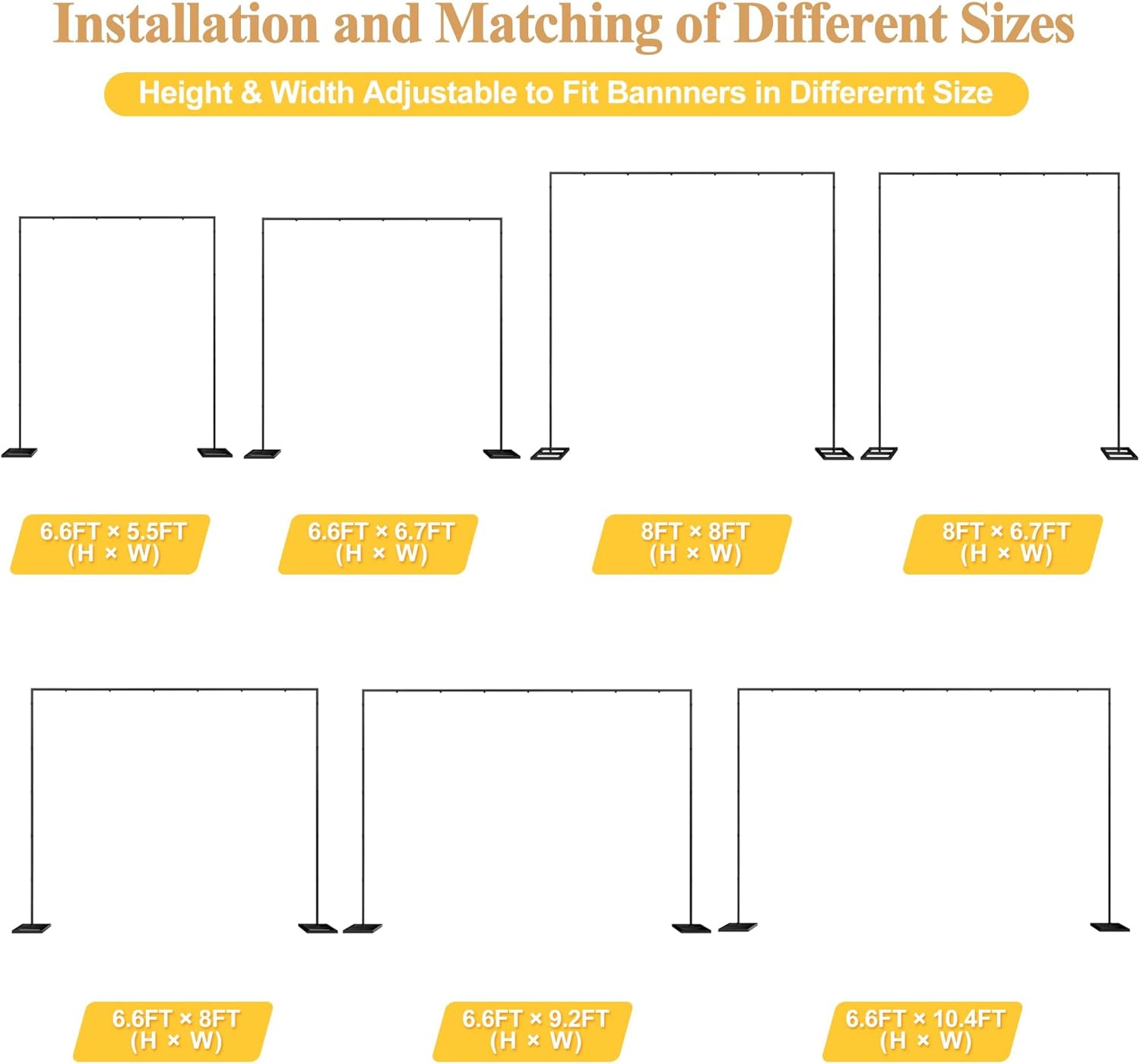 • 【Adjustable Backdrop Stand for Parties】Heavy duty backdrop stand can be freely assembled into 20 different sizes according to your needs. Minimum 6.6 x 5.5ft to maximum 8 x 8ft. Please refer to the instructions or product detail description for specific installation assembly size.