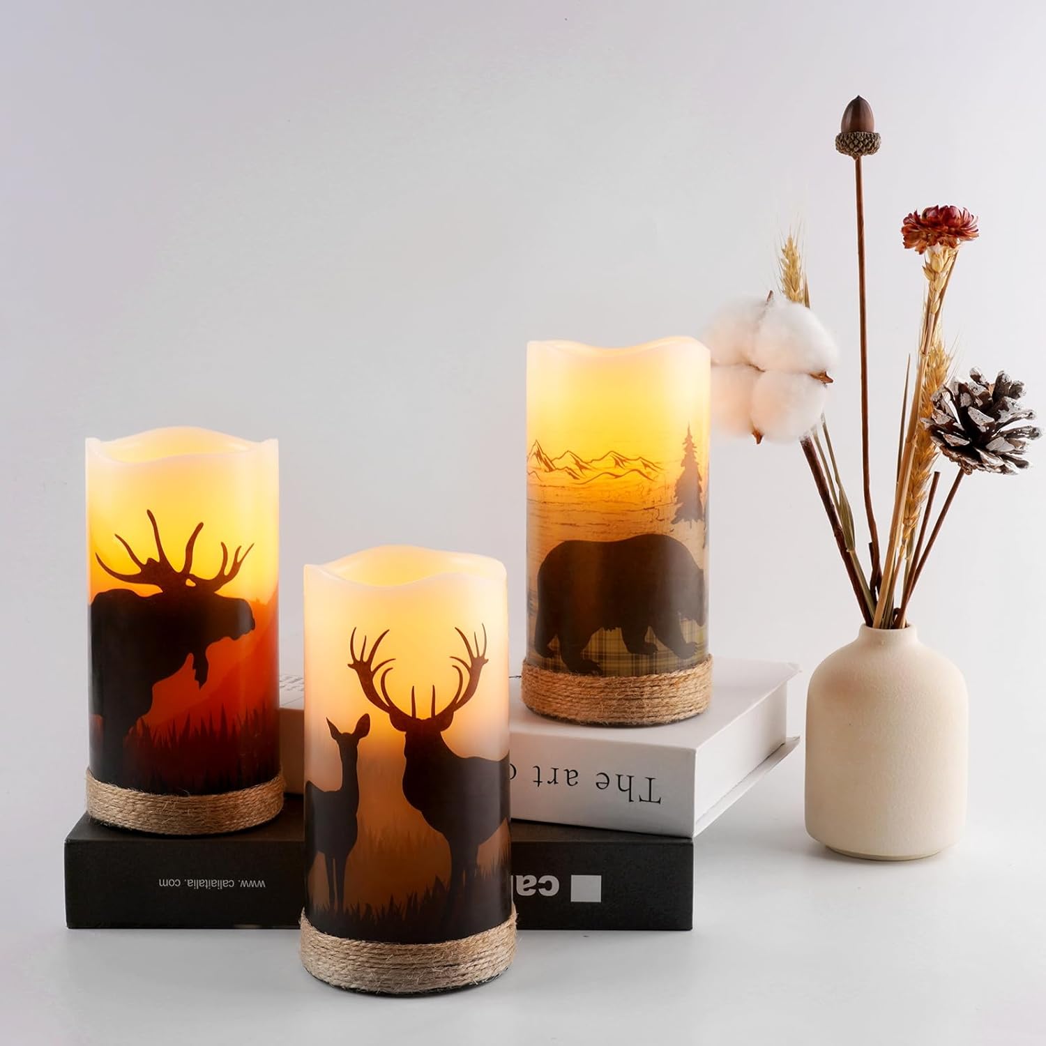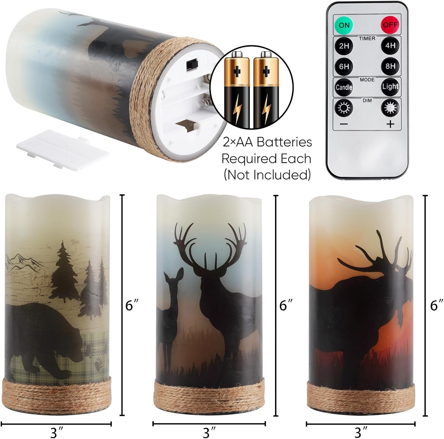 Homemory Christmas Flameless Candles Battery Operated with Rope, Deer, Bear, Moose, Remote Control and Timers, Rustic Country Home Farmhouse Cabin Decor Gifts, 3”x 6”
