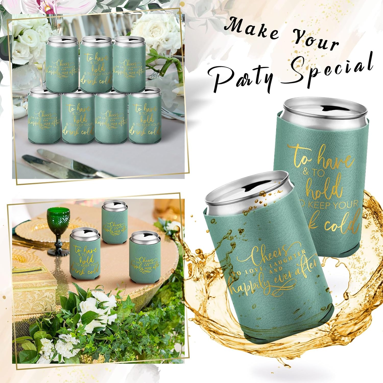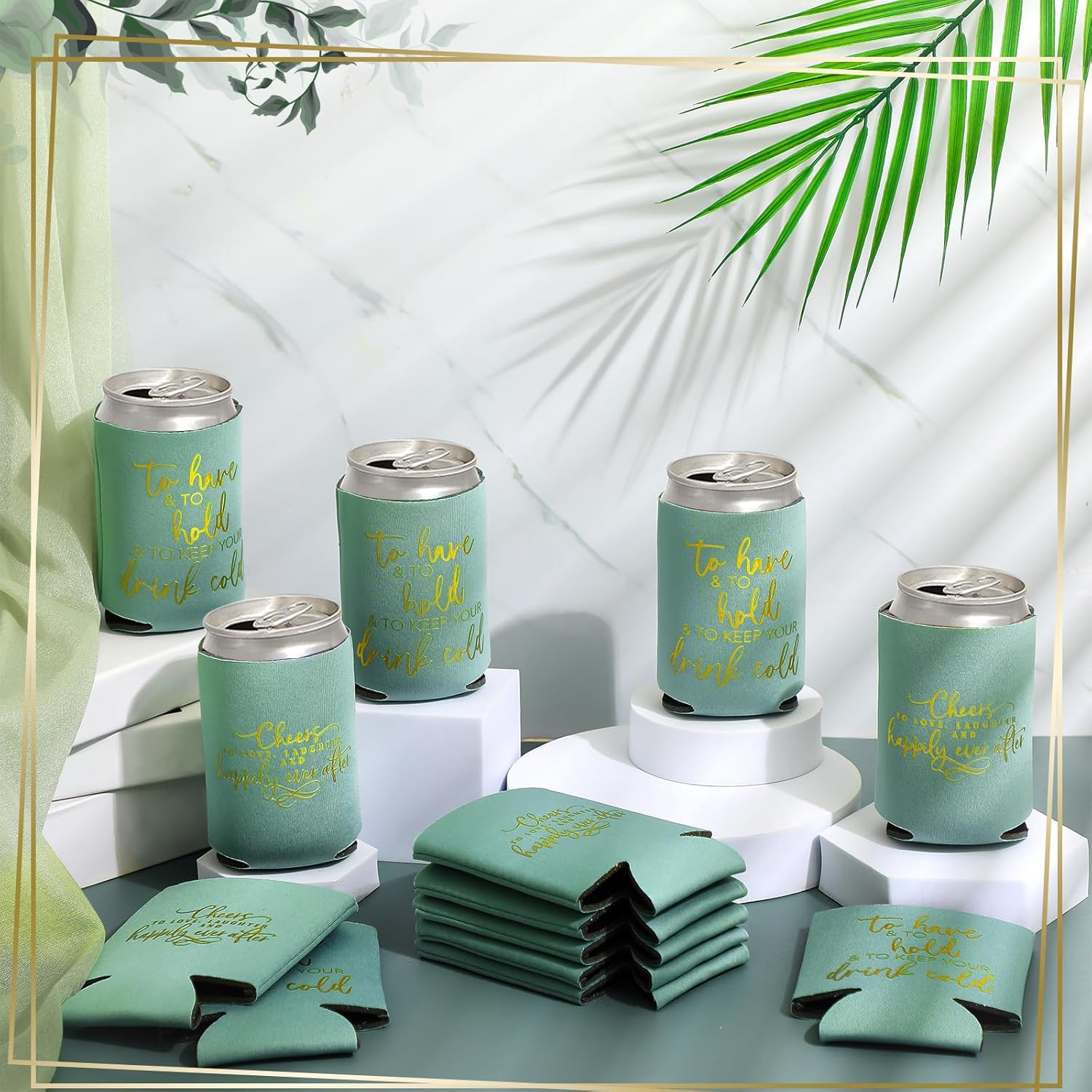 • Satisfying Party Package: our huge package containing 50 pieces of wedding can cooler decorations; Make every drink a celebration with our green and gold can coolers; They are suited to uplift the atmosphere at weddings, bridal showers, and bachelorette parties