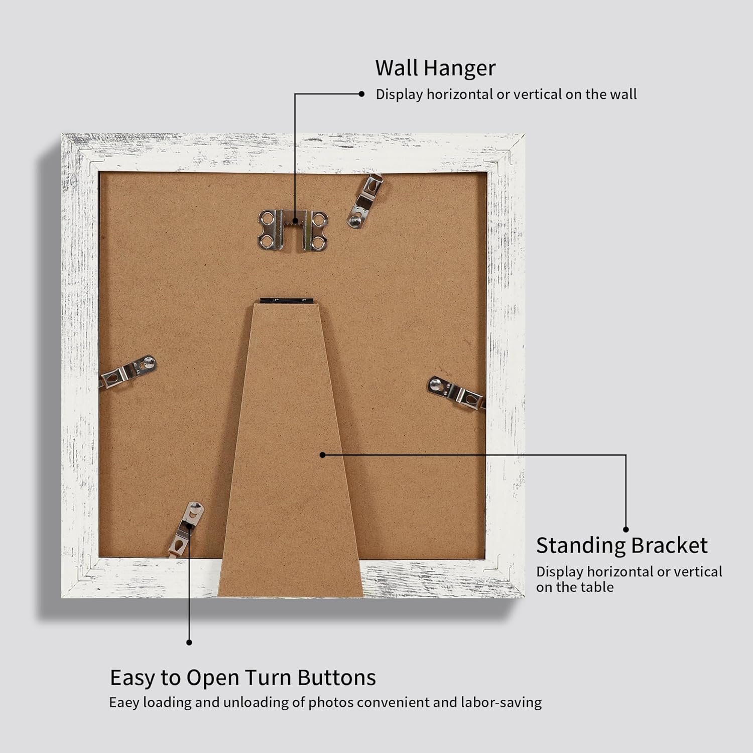 • Multi Frames Collage Set: Includes 4 frames in the same size. Perfectly fits 6x6 inch pictures with mat or 8x8 inch without mat. The frame opening display size is 0.5 inches smaller than the photo size for secure mounting.