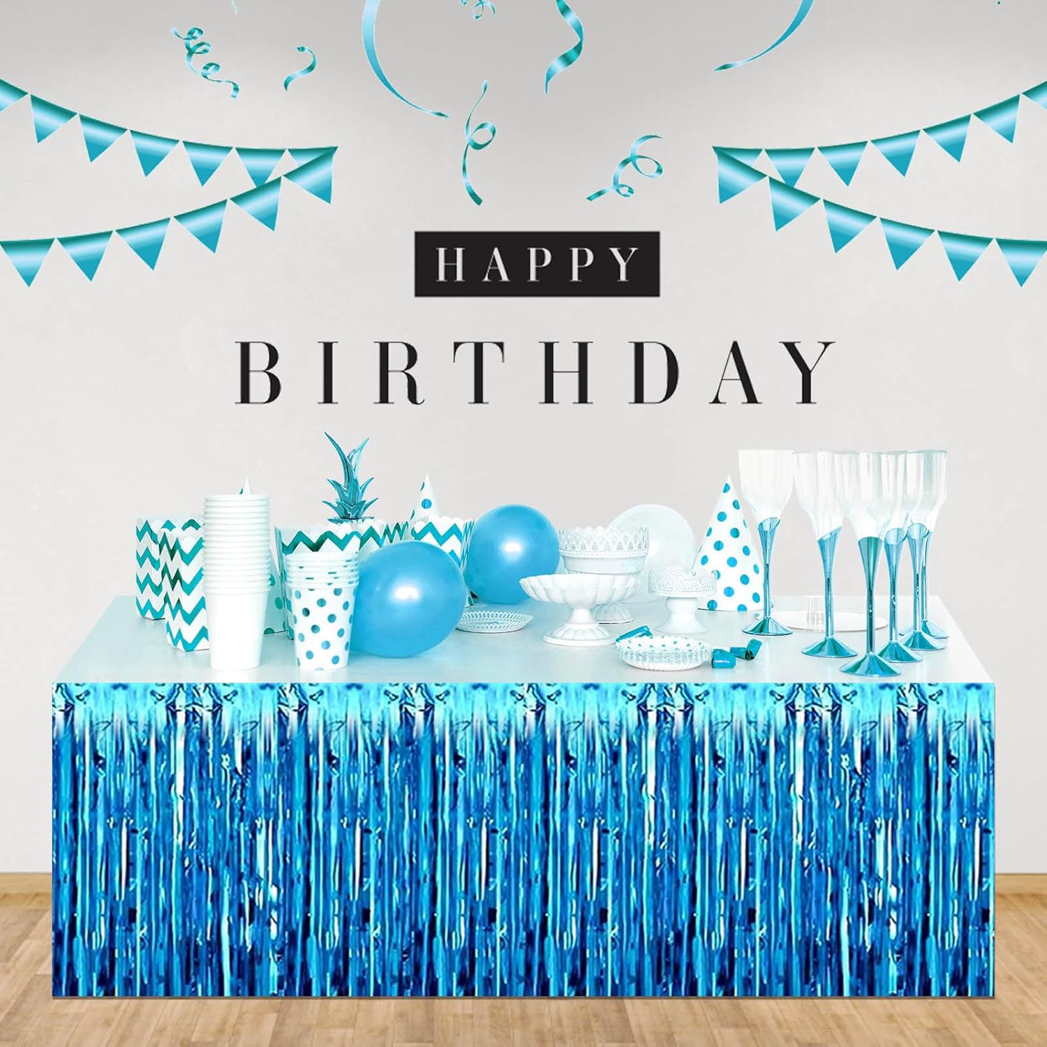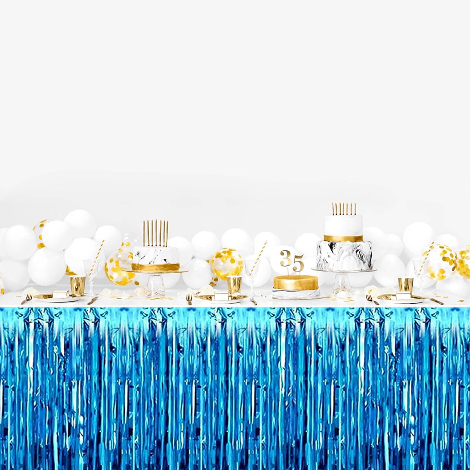 3 Pack 29 x108 Inch Lake Blue Foil Fringe Table Skirts Metallic Banner for Tinsel Streamer Garland Backdrop for Parade Floats Wedding Thanksgiving Birthday Christmas New Year Party Decoration