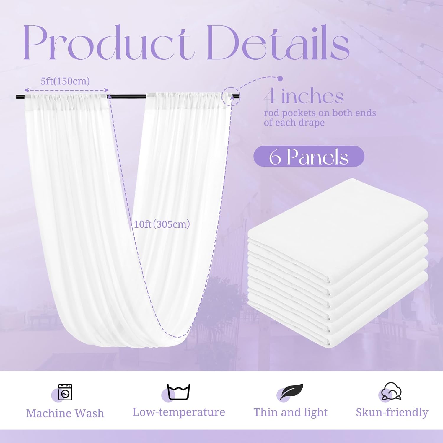 • 【Package Includes】The package will include 6 panels white wedding ceiling drapes (Not include stand), each wedding extra long curtain measures 5 feet (60inch)wide x 10 feet(120inch) long.The sufficient quantity can meet your demands for decorating your weddings, parties, receptions.