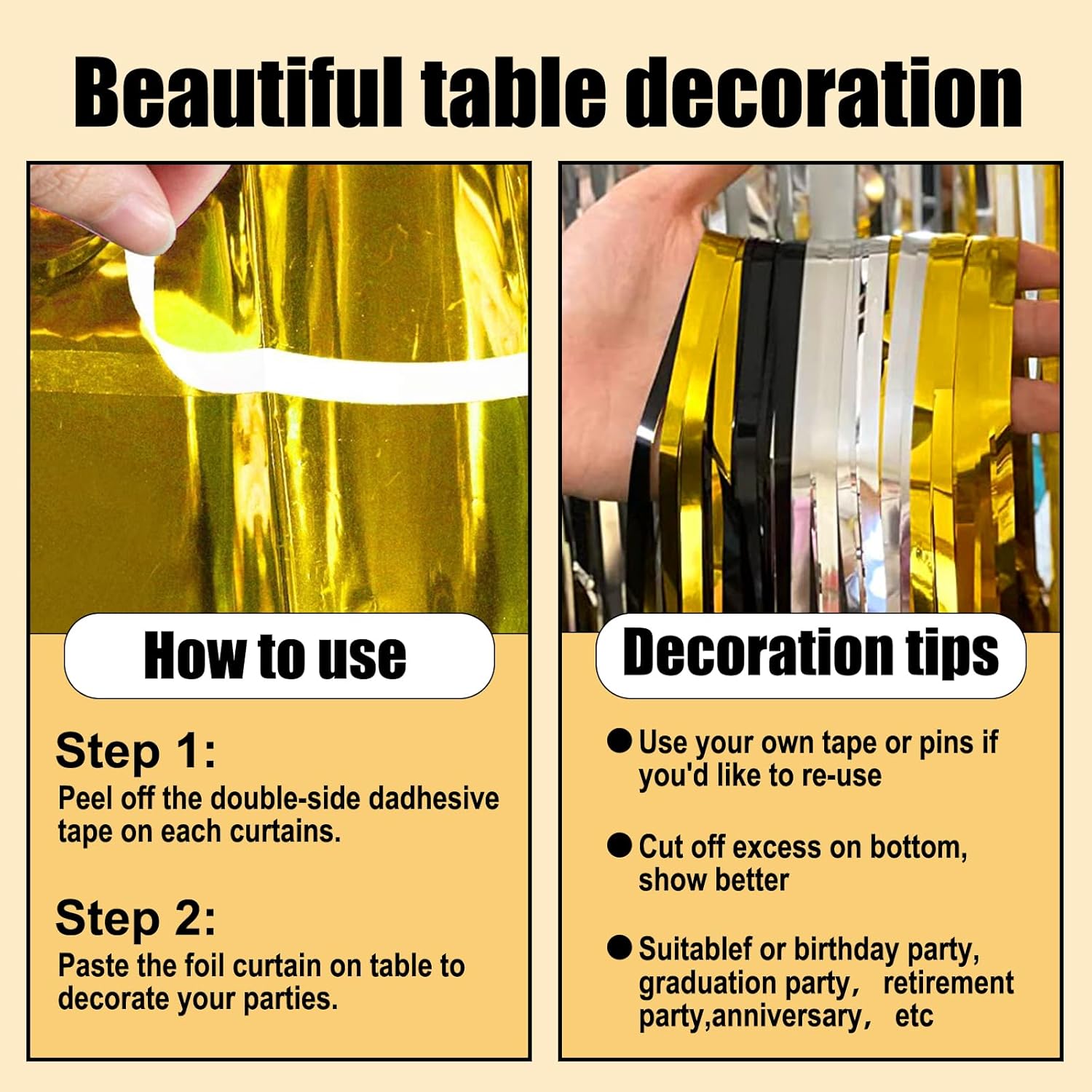 • Easy to Use: the foil fringe table skirts are made of metallic foil, lightweight and easy to use; Each metallic fringe table skirts comes with self-adhesive tape on the top for easy attachment to your wall or table, great for your party venue decoration.