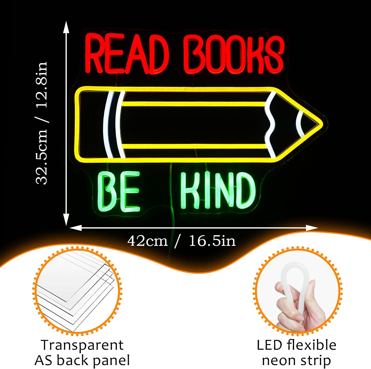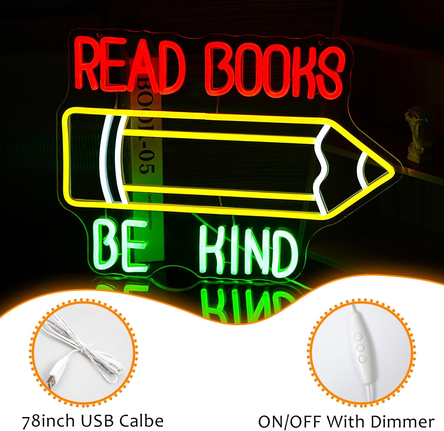 Read Books Be Kind Neon Sign Pencil Led Neon Light for Wall Decor USB Powered Be Kind Neon Light Sign Dimmable Read Books Light Up Sign for Classroom Study Room Library Bedroom Bookstore (16.5*12.8In)