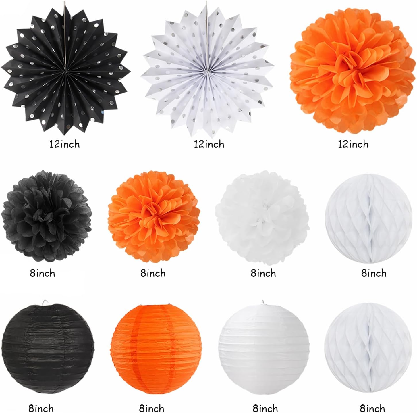 • 【Black White Orange Party Kits】This kits include 1pcs happy halloween banner, 1pcs circle dots paper banner, 4pcs tissue pom poms: 3pcs 10" and 1pcs 12" , 3pcs 8inch paper honeycom ball, 2pcs 8inch paper lantern, 4pcs 12inch paper flower fan, 6pcs Paper swirls hanging streamers.