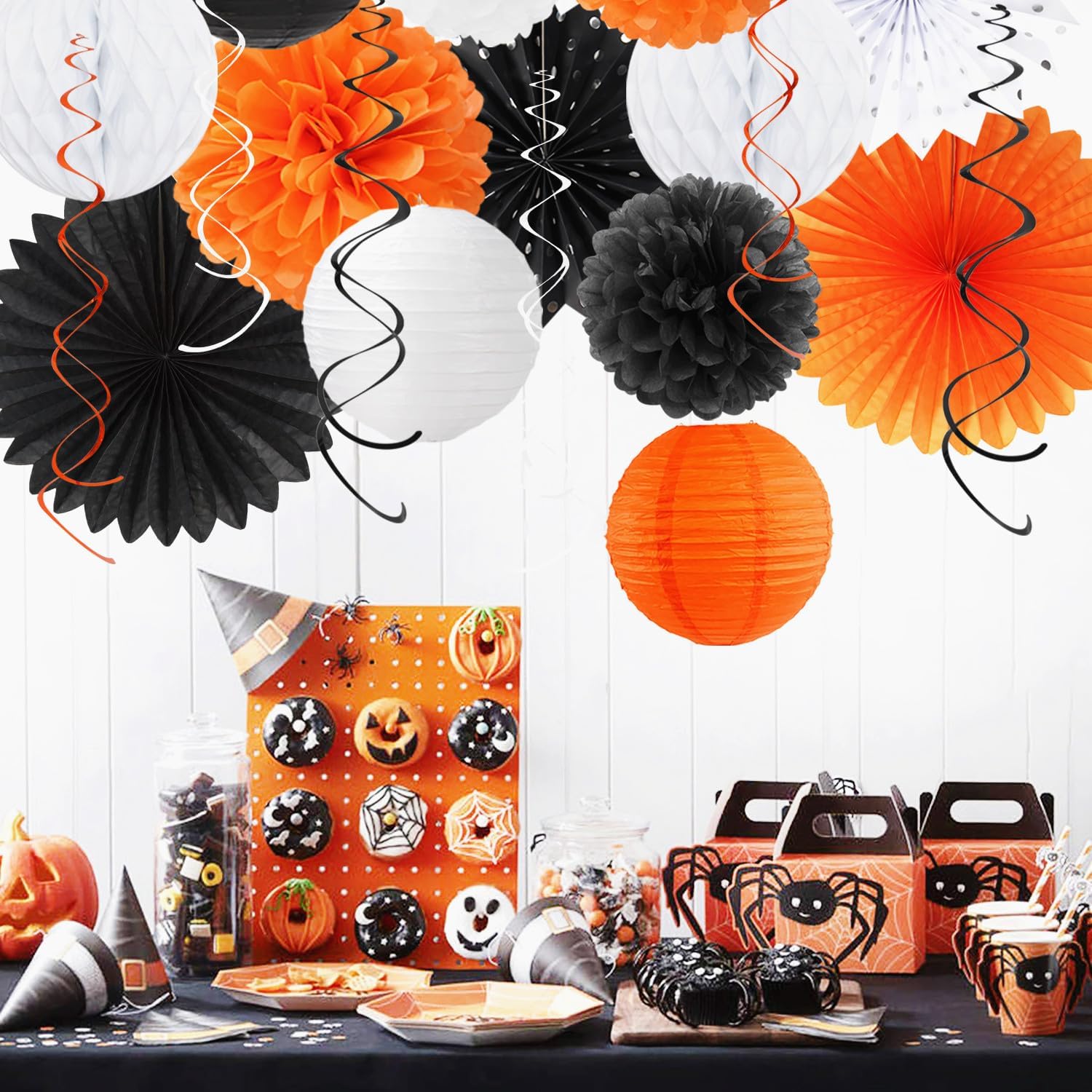 Black-White Orange Happy-Halloween Party-Decorations - 21pcs Birthday Banner,Paper Lanterns Honeycomb,Tissue Pom Poms Flower Fan,Kids Classroom Hanging Streamers Garland Decor Supplies Huglony