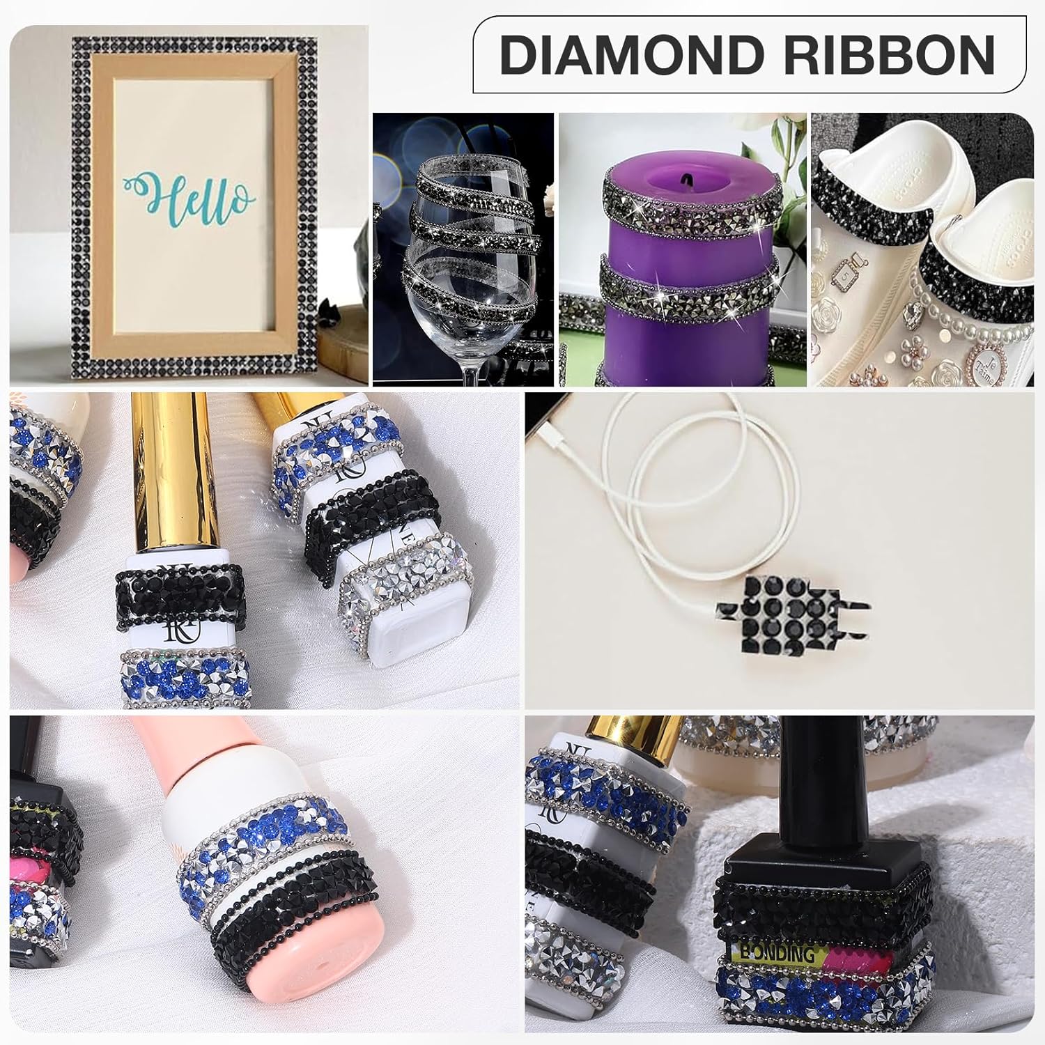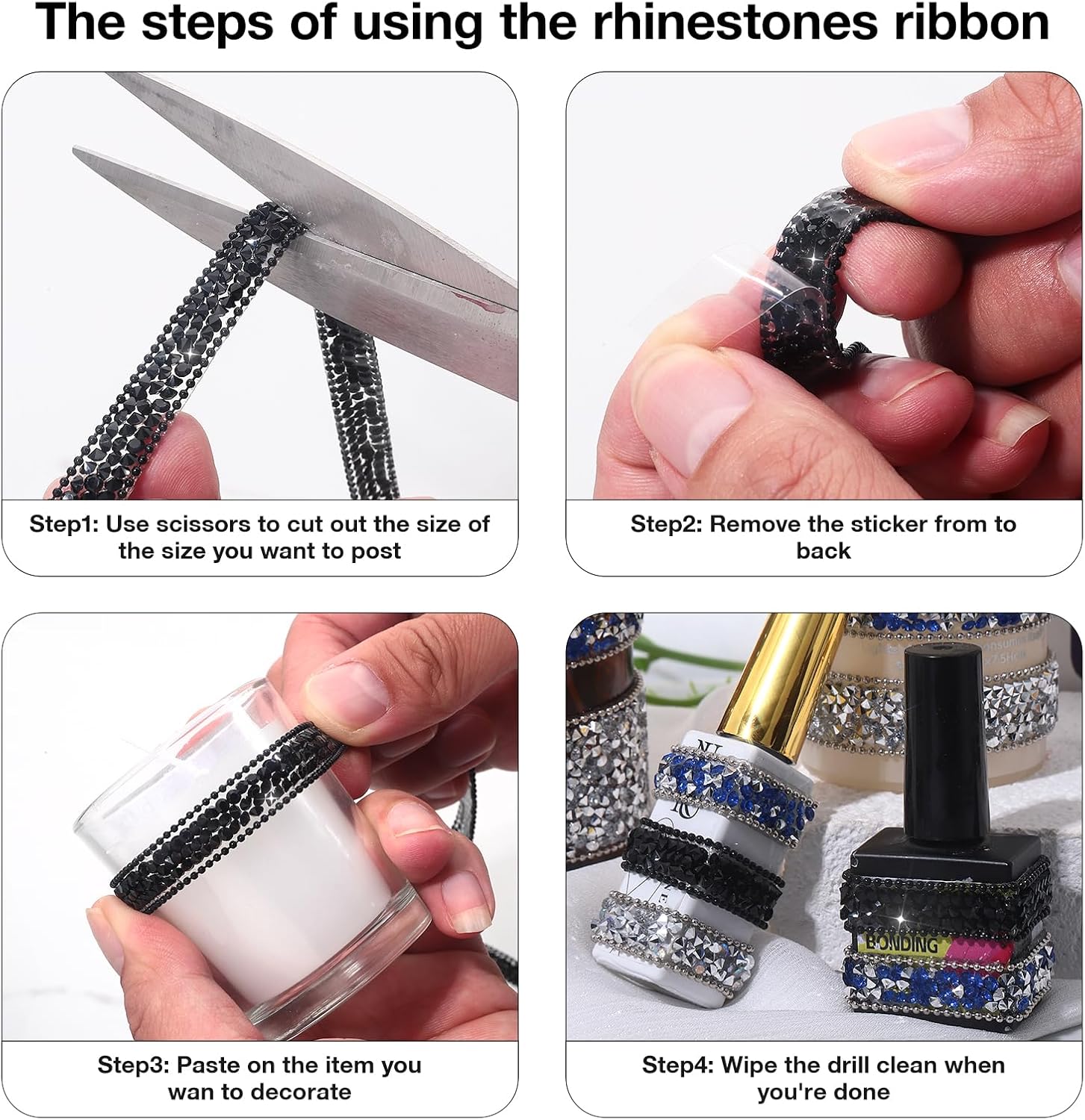 • Self-Adhesive Diamond Ribbon: The self-adhesive design with backing glue makes it possible to stick anywhere as long as the surface is smooth and clean. You cut the rhinestone ribbon into different lengths with scissors, then peel off the back paper of the sticker and paste it on the project you want to decorate.
